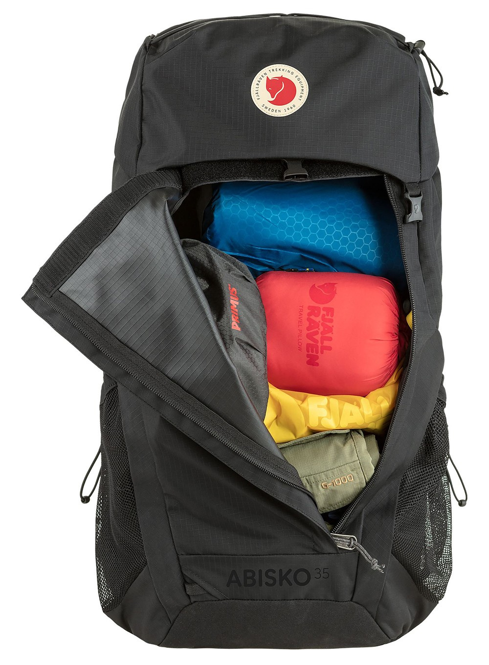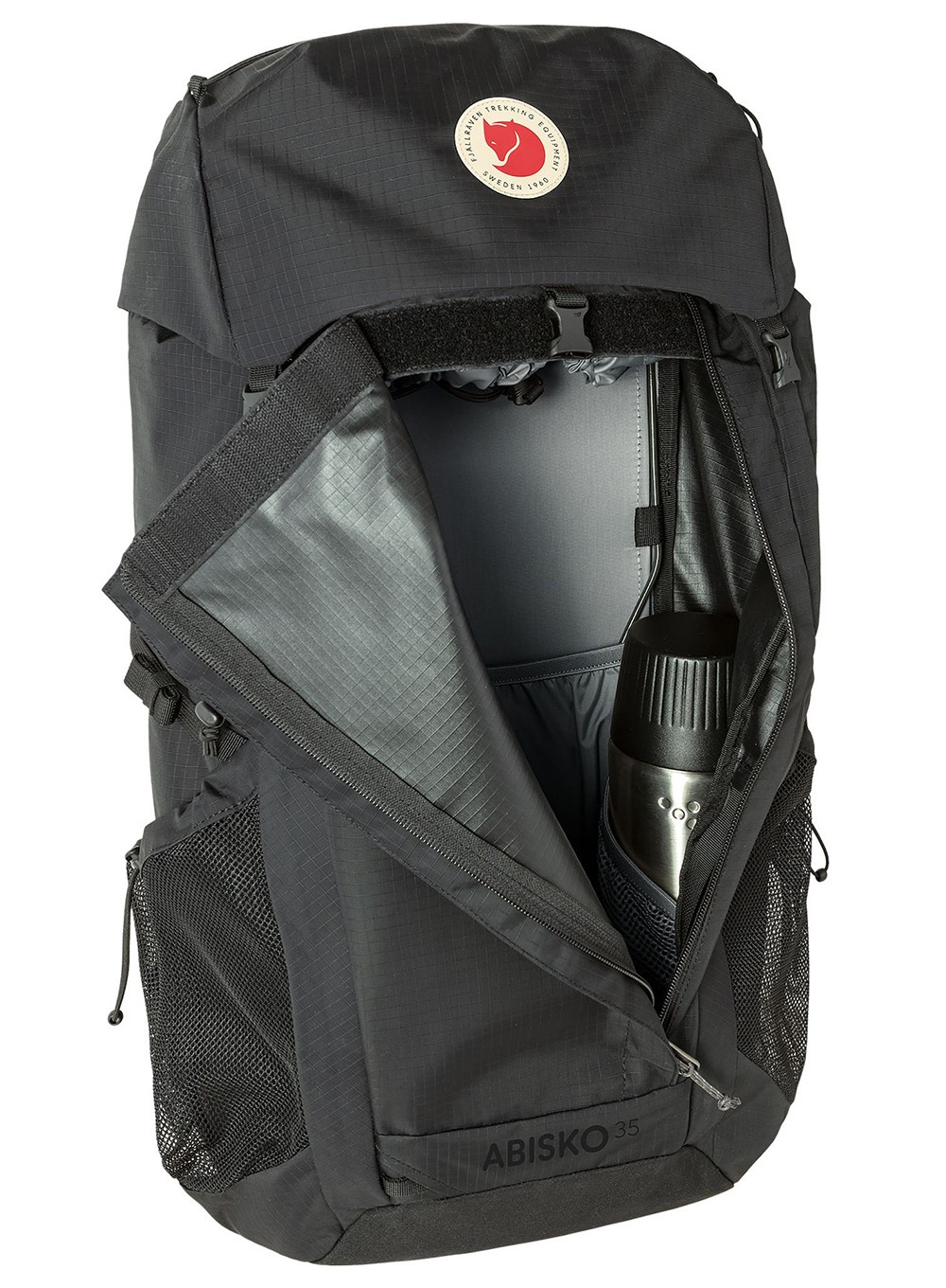 Fjallraven Abisko Hike 35 to model, który posiada ładowaną od góry komorę główną z przednim zamkiem błyskawicznym, a górna zdejmowana pokrywa z elastyczną linką ma dwie kieszenie zapinane na zamek.