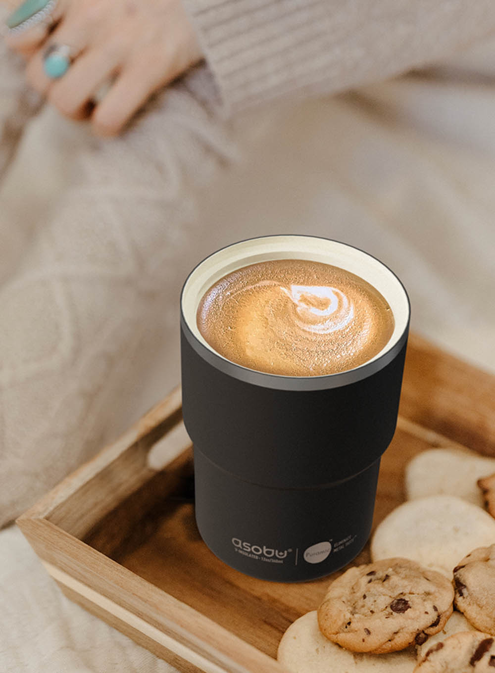 Izolowany kubek Asobu Coffee Express Tumbler 0,36 l z powłoką ceramiczną eliminującą metaliczny posmak - przedłuż chwilę przyjemności z kawą jadąc samochodem!