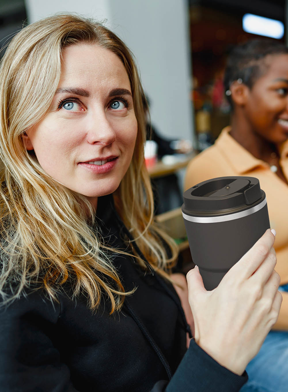 Szczelna, otwierana pokrywka jest łatwa w użyciu i dobrze pasuje do ceramicznej okładziny. Kubek o pojemności 360 ml wygodnie mieści się w każdym standardowym uchwycie na kubek w samochodzie, dzięki czemu możesz cieszyć się kawą w czasie jazdy do pracy!