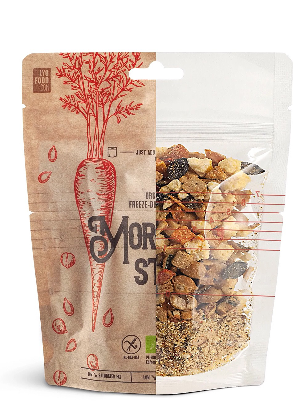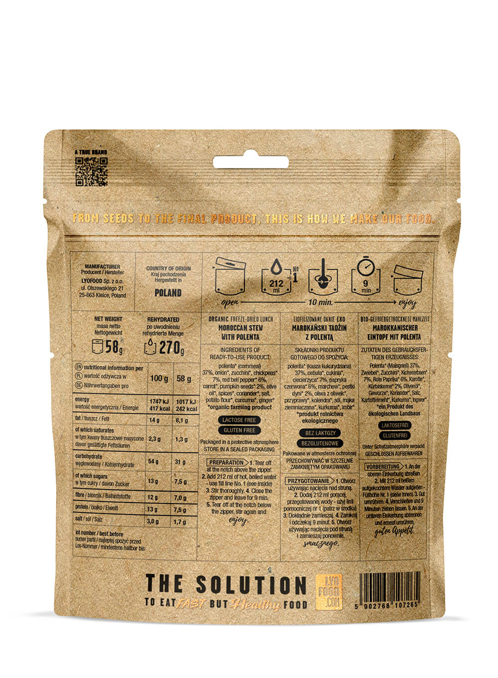 Posiłki LYOFOOD są produkowane wyłącznie w Polsce. Lekkie opakowanie sprawia, że posiłek bez problemu zmieścisz w plecaku czy torbie oraz umożliwia swobodne przygotowanie dania bezpośrednio w opakowaniu.