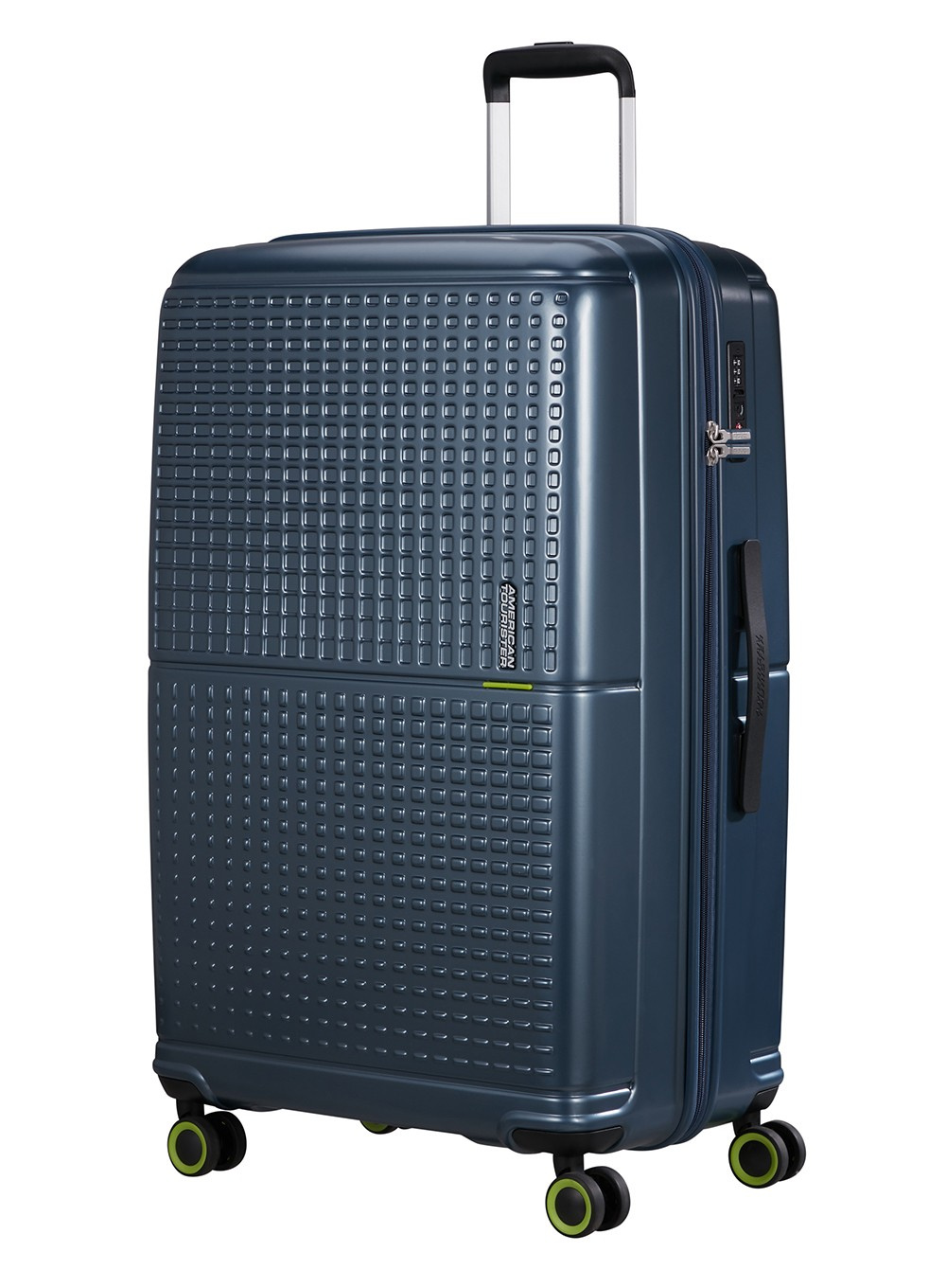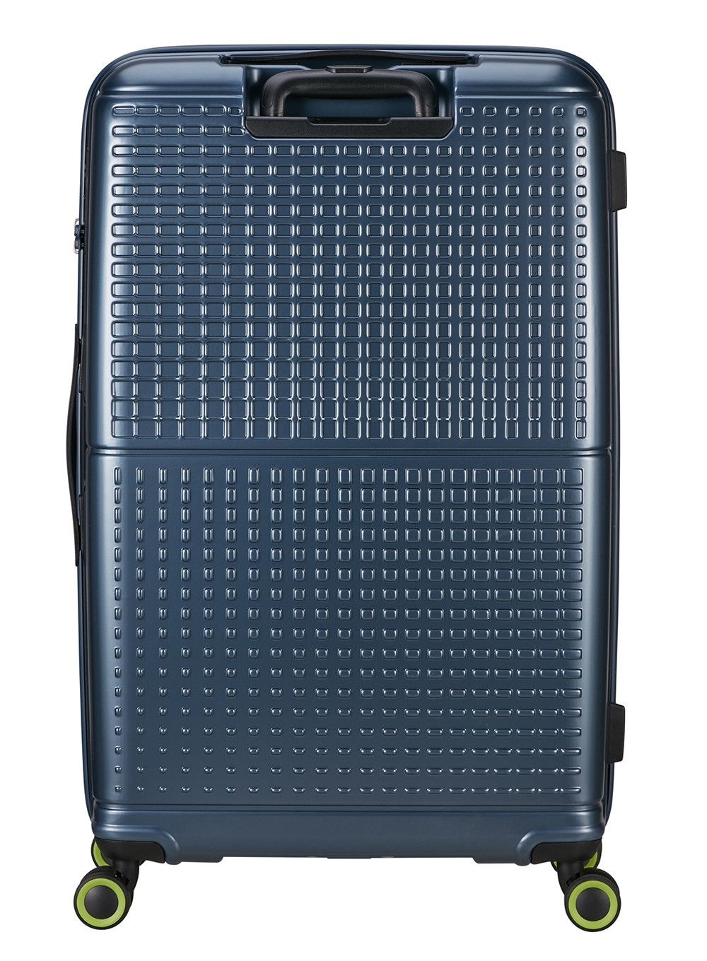 Duża walizka American Tourister z kolekcji GeoPop na nowo definiuje geometryczne projekty dzięki trójwymiarowej teksturze, tworząc nowoczesny industrialny wygląd wzbogacony metalicznym wykończeniem.