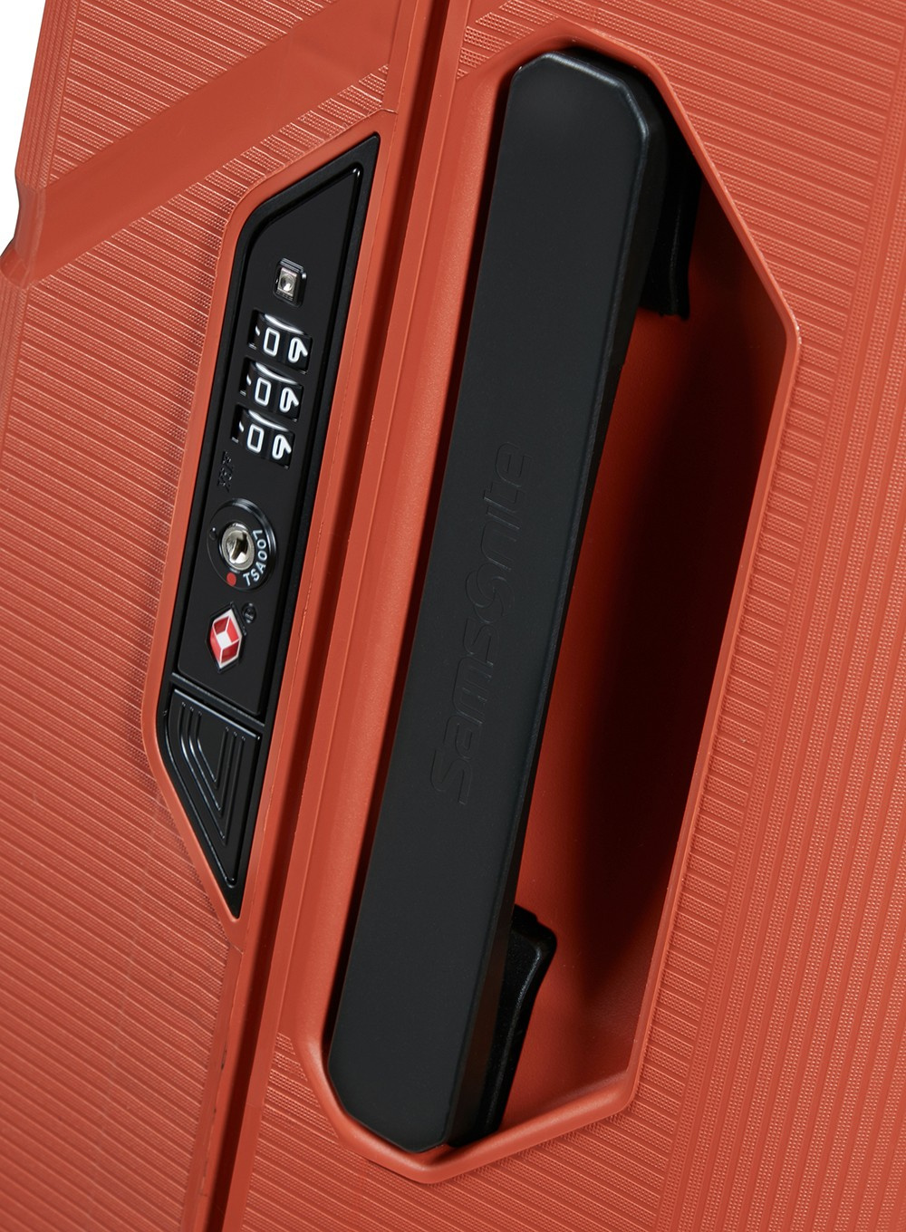 Dzięki zintegrowanemu zamkowi TSA Twoje rzeczy są zawsze bezpieczne w podróży. 3-punktowa blokada jest bezpieczna i łatwa w użyciu. Solidna i wytrzymała konstrukcja dzięki zastosowaniu samowzmacniającej się konstrukcji i użyciu wysokiej jakości polipropylenu z recyklingu.