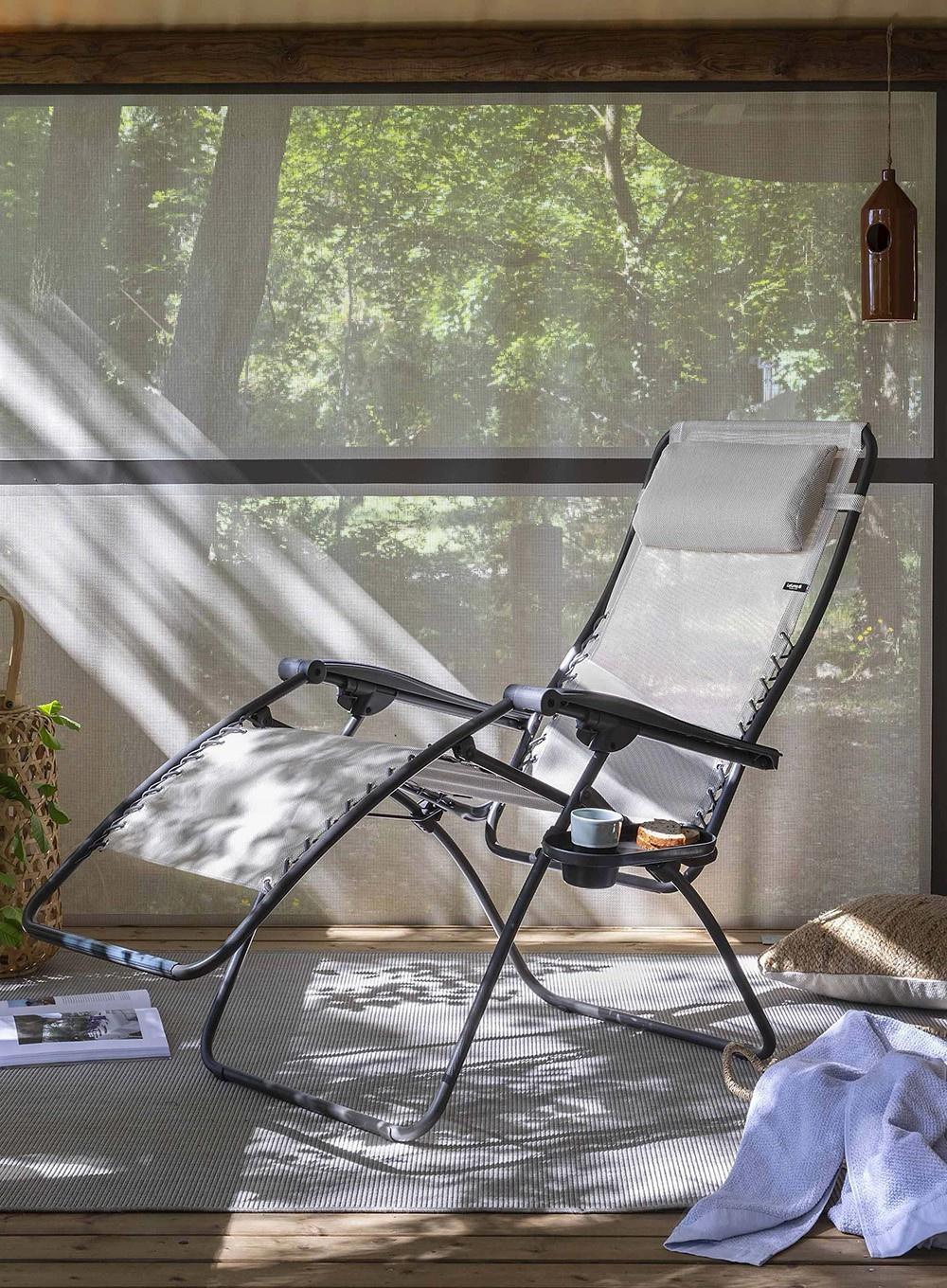 Tkanina siedziska jest zawieszona na elastycznych sznurowadłach, co zapewnia większą elastyczność. Lekki, składany, wytrzymały i praktyczny, oferuje pozycję Zero Gravity dla optymalnego relaksu. Ekologiczny relaks - tkaninę fotela można łatwo zdjąć i wymienić.