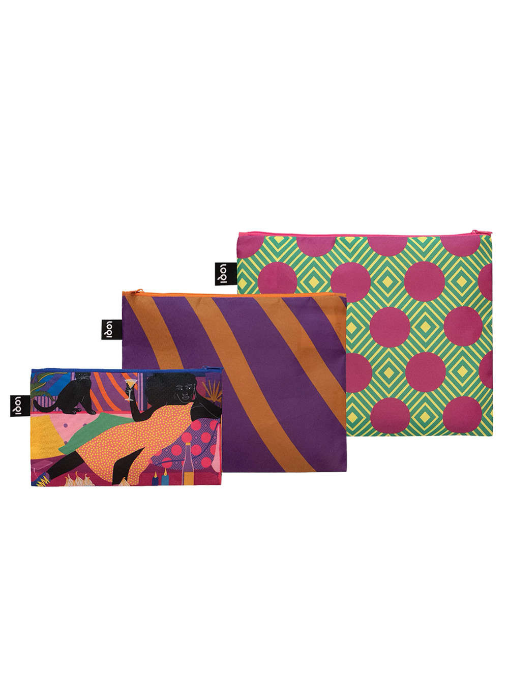 Zestaw trzech różnych saszetek Loqi Recycled Zip Pockets o uniwersalnym zastosowaniu.