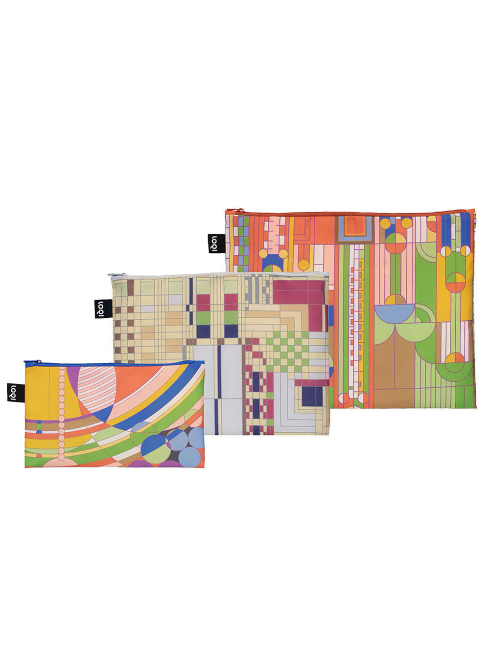 Zestaw trzech różnych saszetek Loqi Recycled Zip Pockets o uniwersalnym zastosowaniu.