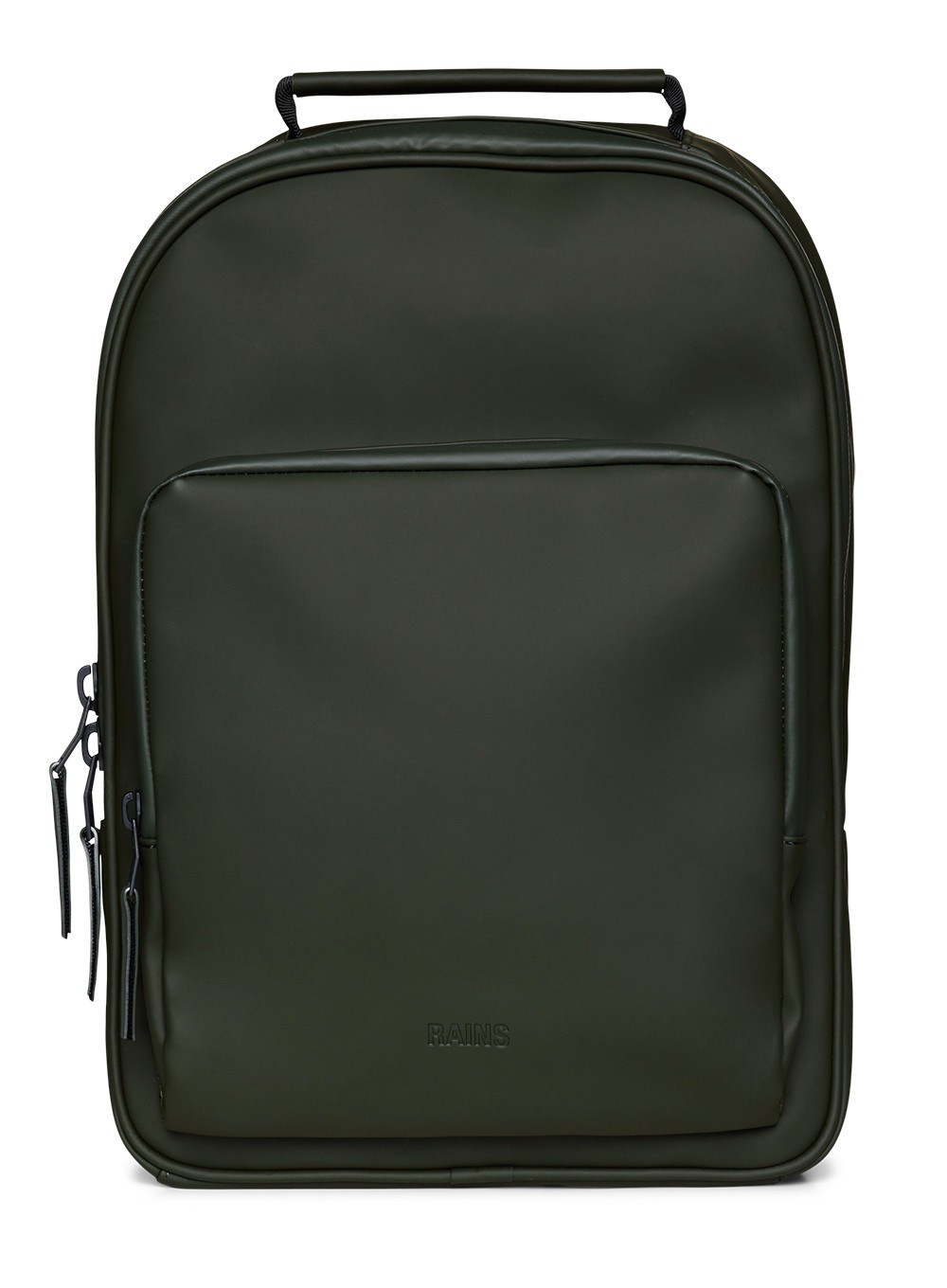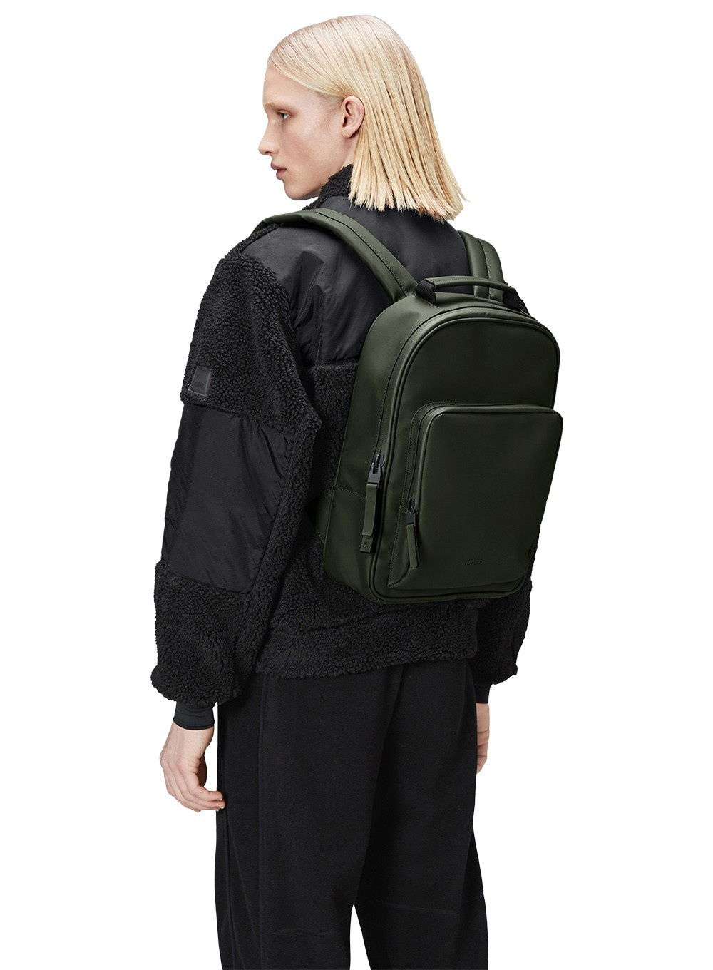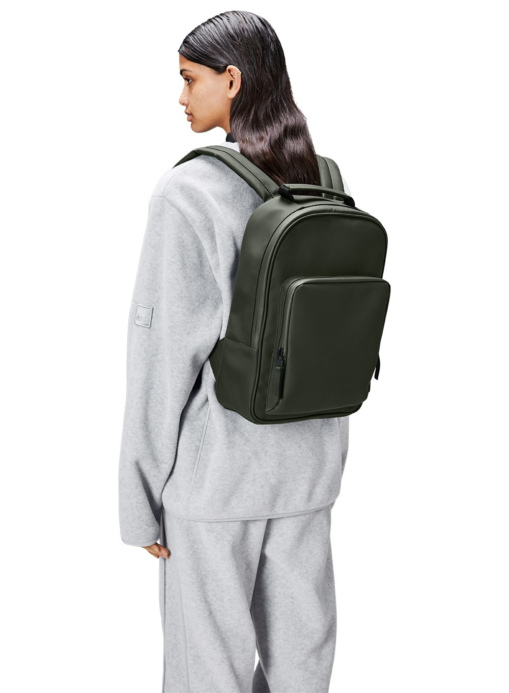 Rains Book Daypack to wodoodporny plecak codzienny, szkolny o minimalistycznym kroju i proporcjach odpowiednich dla studentów. Projekt charakteryzuje się zakrzywioną górą, ostrą podstawą i dużą przednią kieszenią na zamek.