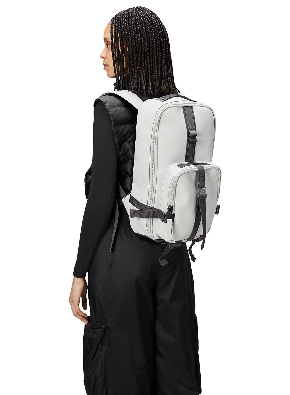 Plecak miejski, codzienny Rains Trail Rucksack z kieszenią na 15-calowego laptopa i zewnętrznymi pasami kompresyjnymi o modnym, współczesnym wyglądzie.