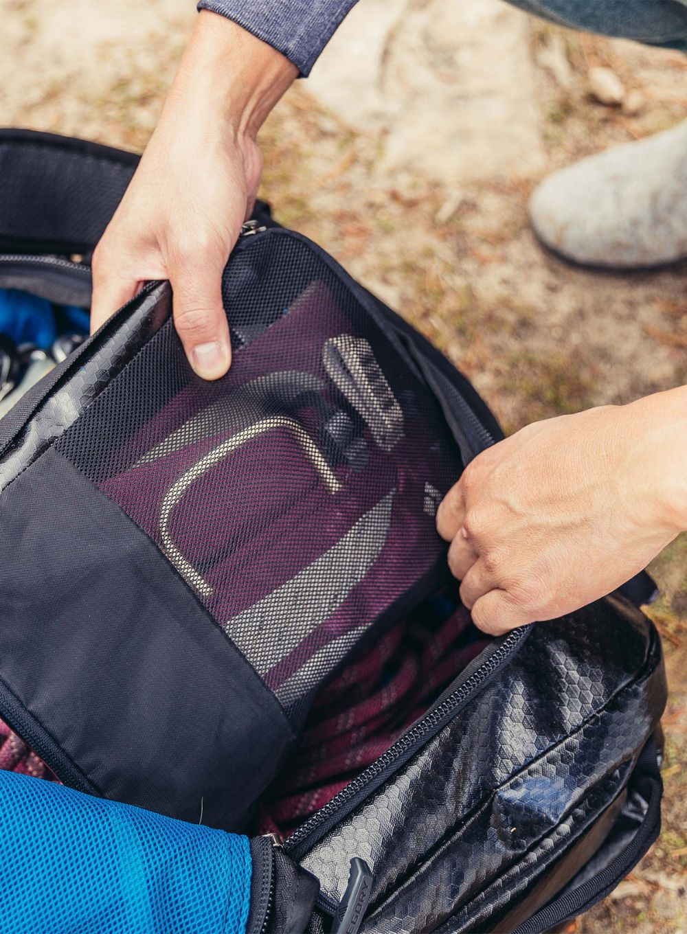 • Rozszerzana kieszeń zapinana na zamek błyskawiczny pozwala oddzielić brudny sprzęt i ubrania od zawartości głównej komory