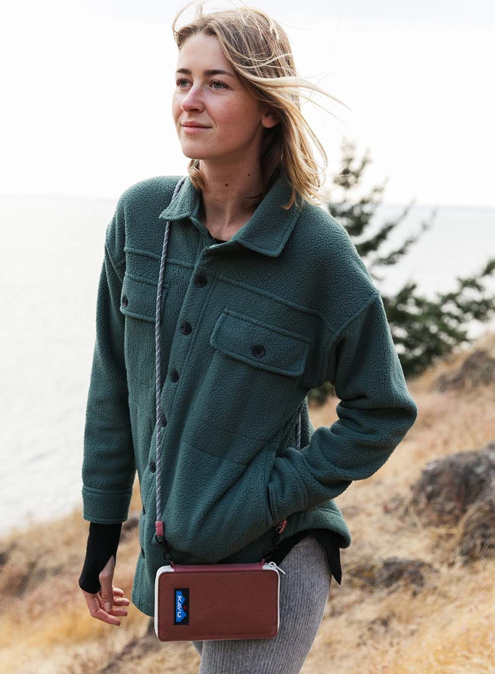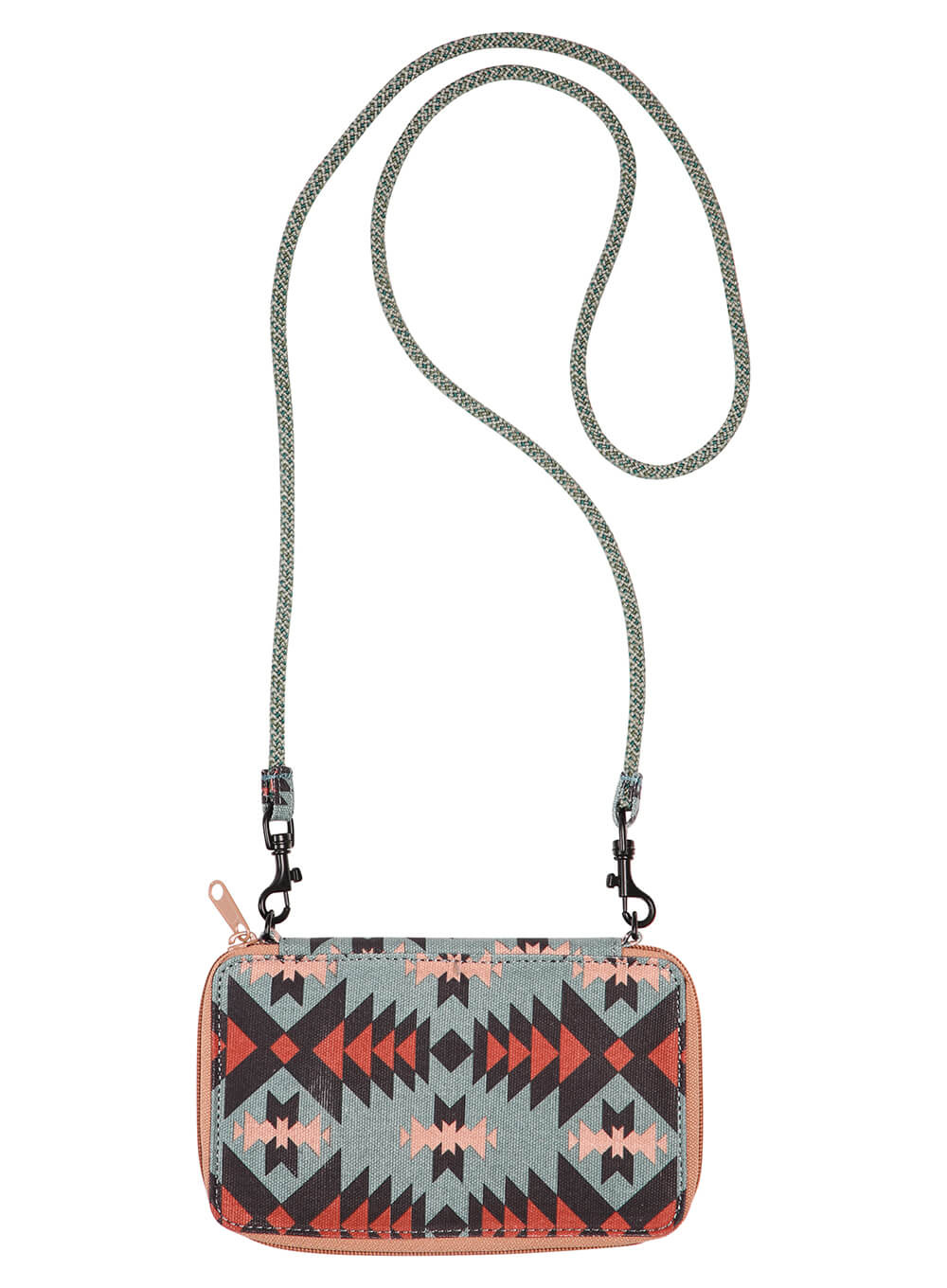 Składane etui z portfelem Go Time ma linowy pasek na ramię z karabińczykami, który łatwo można odpiąć. Jedna główna komora zapinana na zamek, wewnętrzna kieszeń zapinana na zamek oraz wiele wewnętrznych przegródek na gotówkę, karty i dowód osobisty.