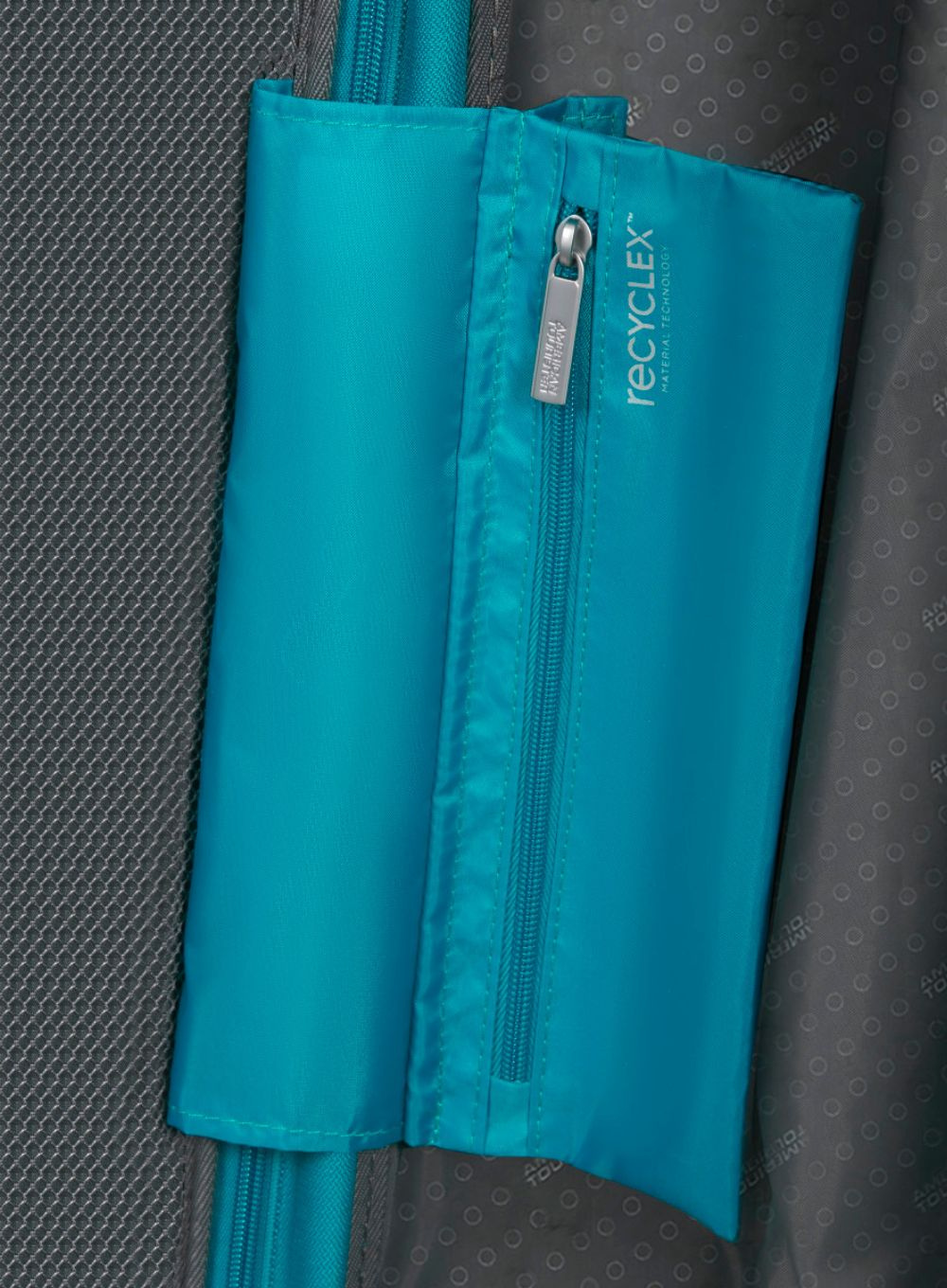 - Wnętrze, materiał ekspandera (klina poszerzającego) i zamki błyskawiczne wykonane są z poliestru rPET z 24 butelkami PET pochodzącymi z recyklingu, przy użyciu technologii materiałowej Recyclex™
