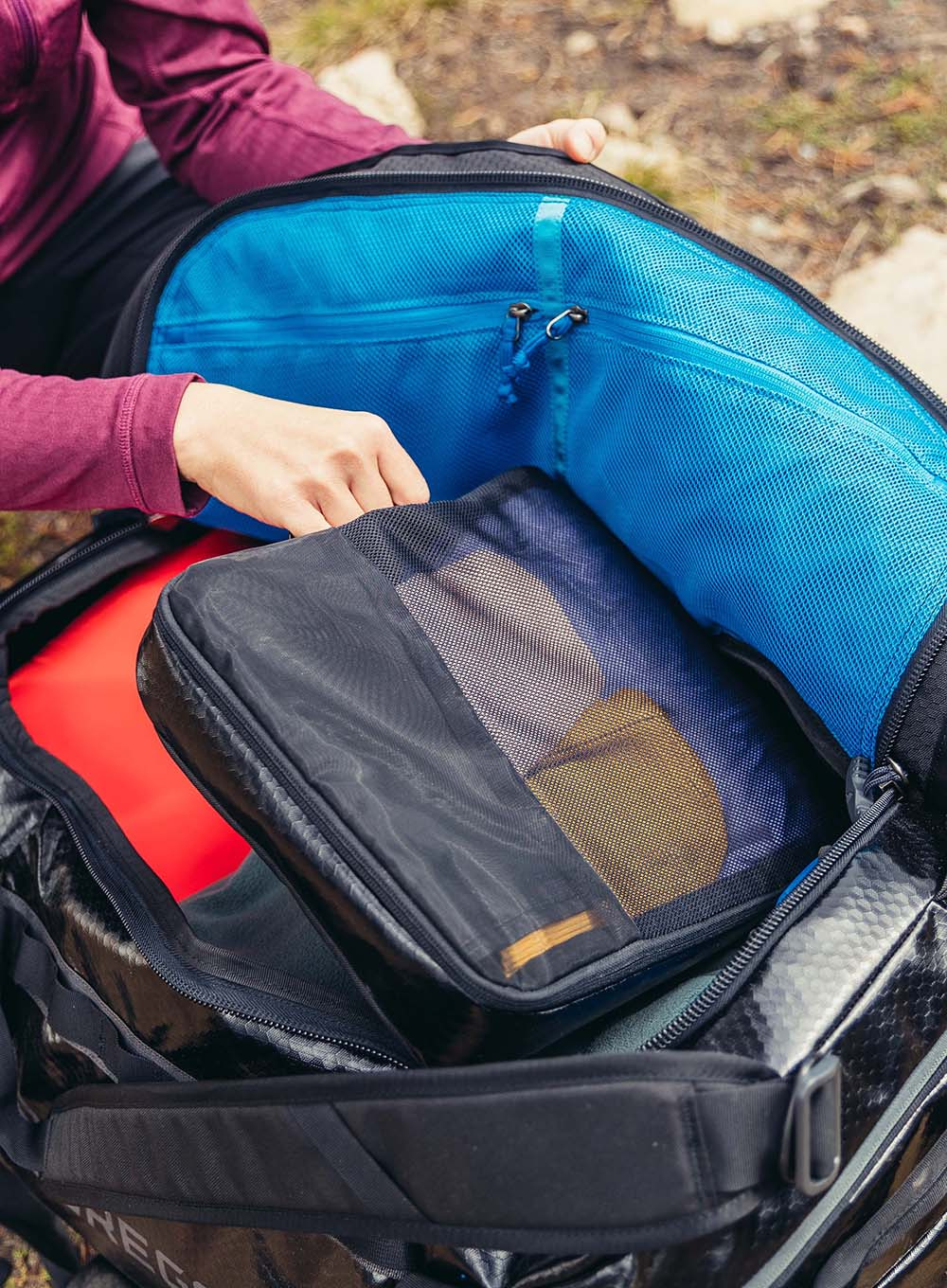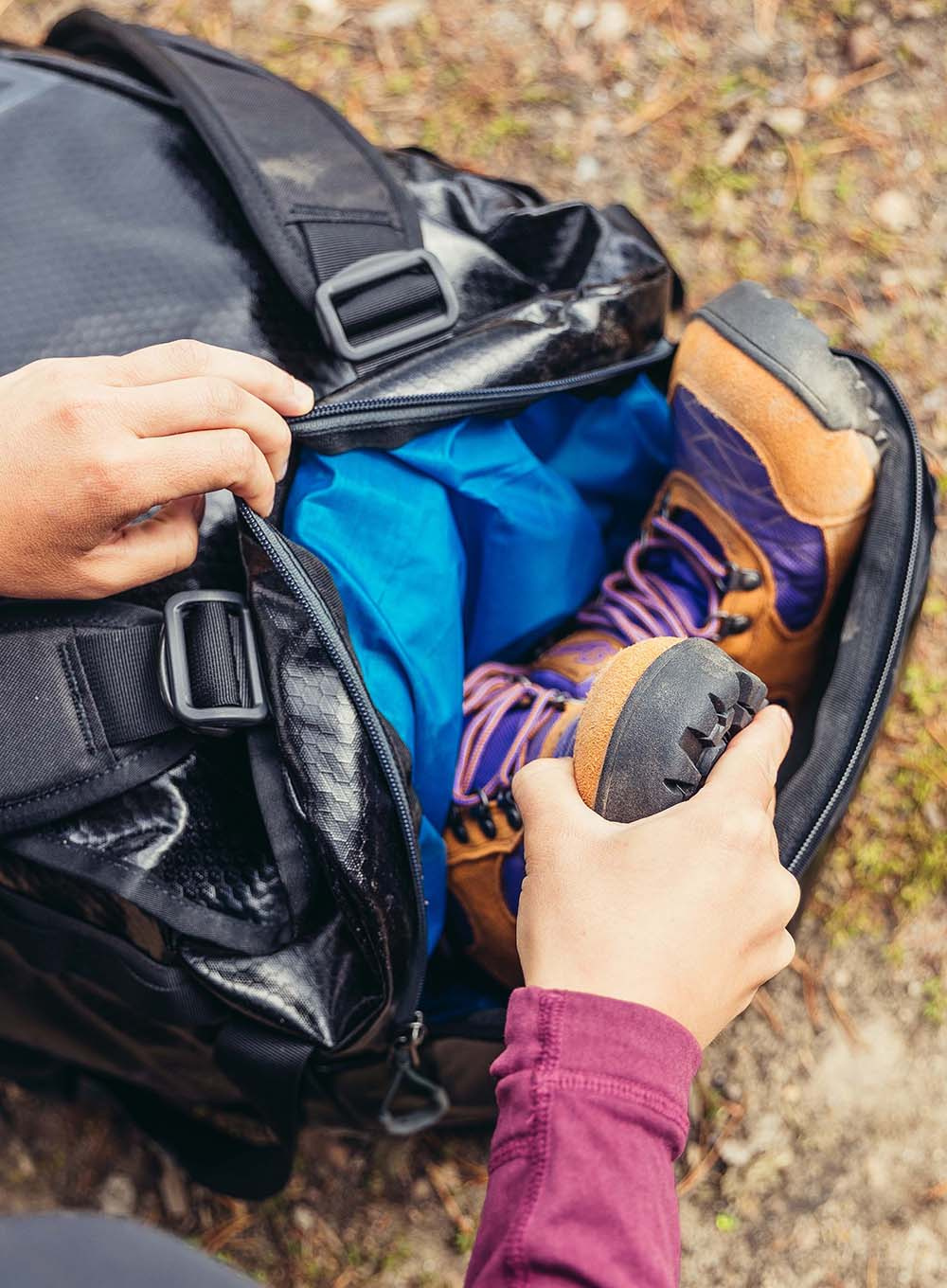 Rozszerzalna kieszeń na końcu torby zapewnia przestrzeń do oddzielnego przechowywania przepoconej odzieży i brudnego sprzętu.