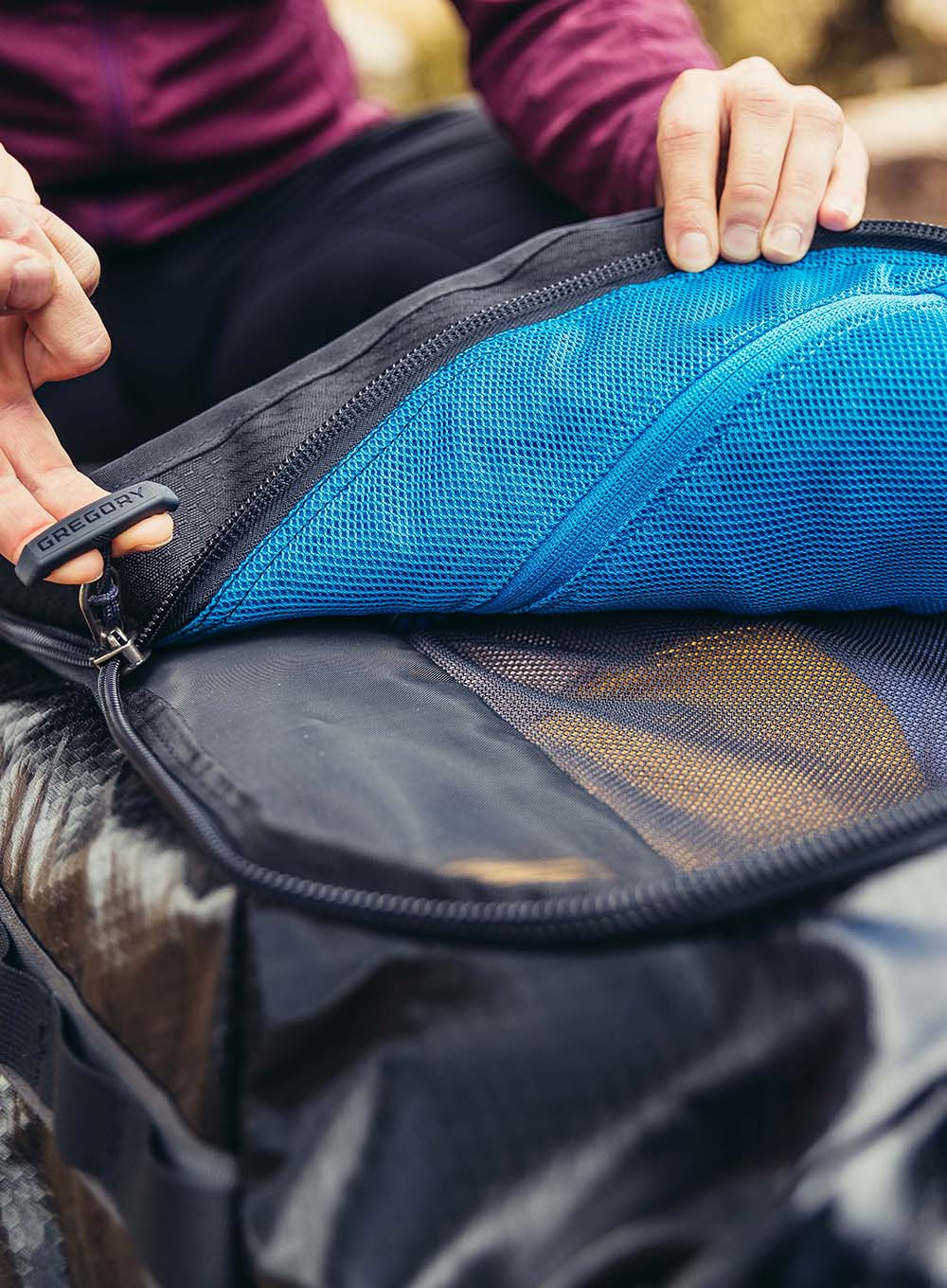 • Rozszerzana kieszeń zapinana na zamek błyskawiczny pozwala oddzielić brudny sprzęt i ubrania od zawartości głównej komory