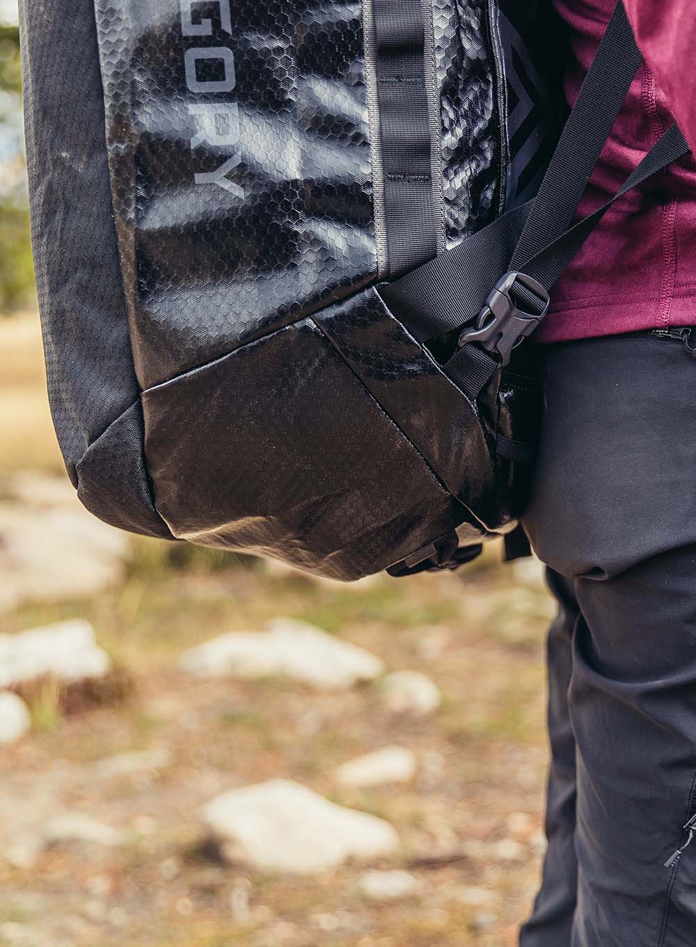 • Materiał: korpus: poliester Ripstop 900D 40% z recyklingu z powłoką TPU odporną na warunki atmosferyczne; uprząż / pas biodrowy / lędźwiowy: pianka EVA; podszewka: poliester 135D pochodzącego z recyklingu pokonsumenckiego z DWR niezawierającym PFC; klamry zatwierdzone przez Bluesign