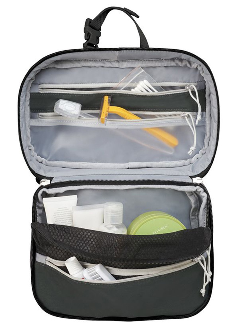 Niewielka i lekka kosmetyczka podróżna Osprey Transporter Hanging Toiletry Kit z haczykiem do powieszenia i licznymi kieszeniami do łatwej organizacji Twoich kosmetyków i akcesoriów toaletowych.