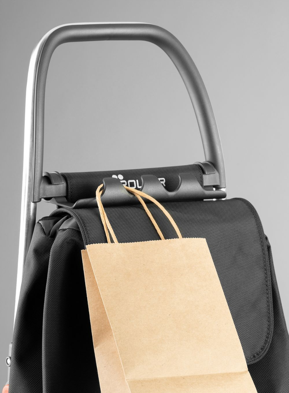 • Poręczny uchwyt pozwala nieść złożony wózek w ręce, w drodze na zakupy, a w trakcie zakupów nie musisz nosić wózka w ręku, dzięki innowacyjnemu zaczepowi (adapterowi) zaczepisz go o wózek marketowy