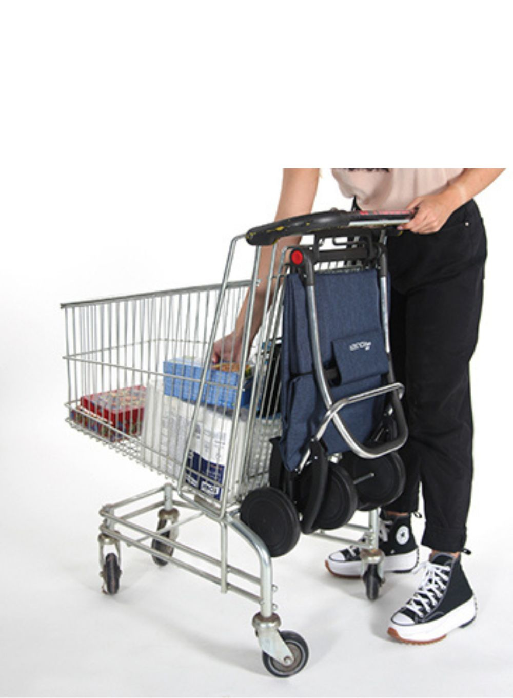- Poręczny uchwyt pozwala nieść złożony wózek w ręce, w drodze na zakupy, a w trakcie zakupów nie musisz nosić wózka w ręku, dzięki innowacyjnemu zaczepowi (adapterowi) zaczepisz go o wózek marketowy