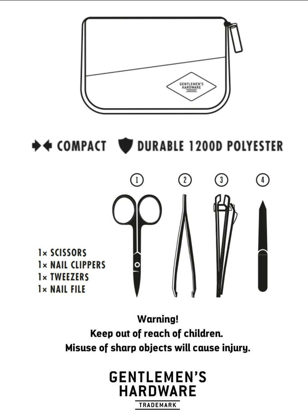 Zestaw zawiera obcinacz do paznokci ze stali nierdzewnej, pęsetę, nożyczki i pilnik.