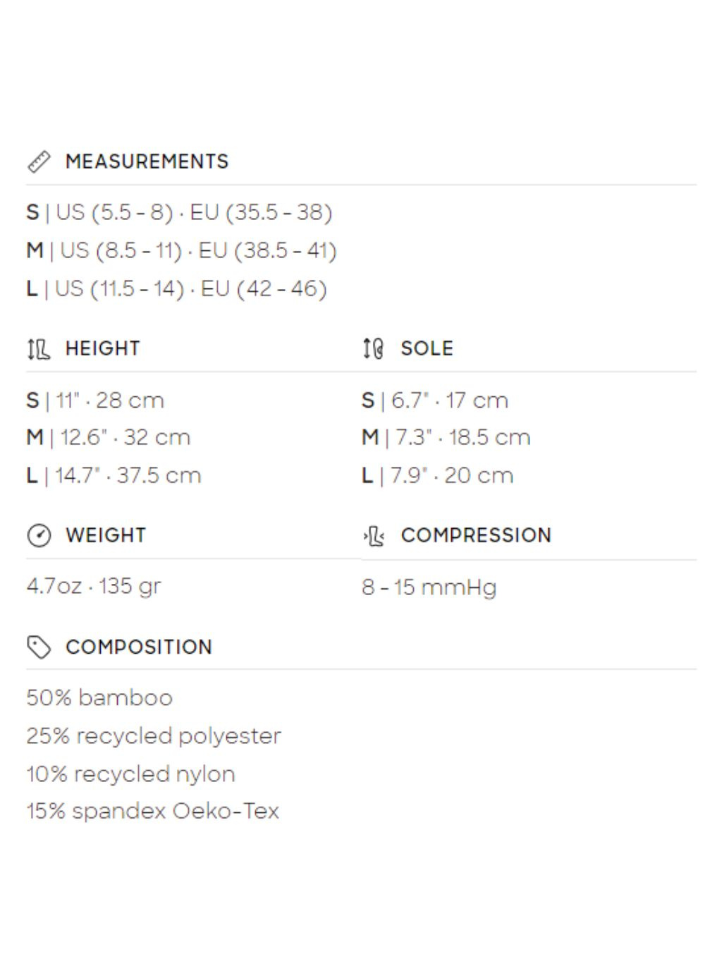 Skarpety uciskowe Bamboo zapewniają stopniową kompresję 8-15 mmHg, która pomaga: poprawić przepływ krwi; zmniejszenie bolesności mięśni; zmniejszają obrzęki i zmęczenie; zapobiega gromadzeniu się krwi.