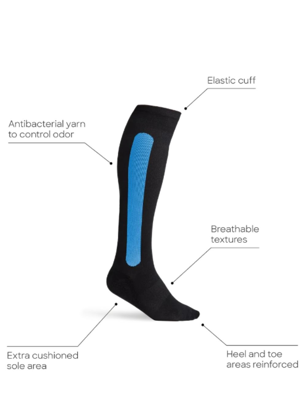 Mieszanka włókien i cechy konstrukcyjne zapewniają wygodę: do kolan; dodatkową amortyzowaną powierzchnię podeszwy; wzmocnione obszary pięty i palców; elastyczny mankiet.