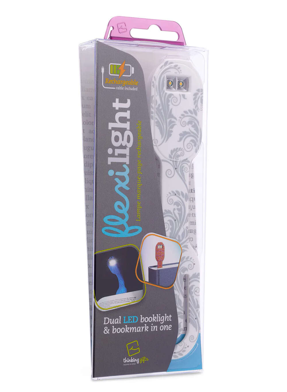 Zakładka do książek Thinking Gifts Flexilight zapewnia 20 lumenów ciepłego światła dzięki 2 energooszczędnym diodom LED, co czyni ją jedną z najpotężniejszych i najbezpieczniejszych lampek do książek na rynku.