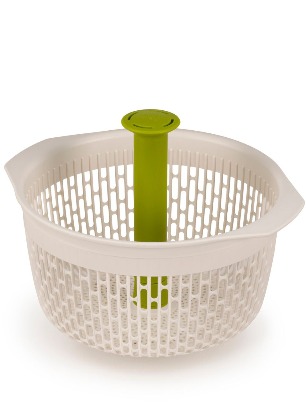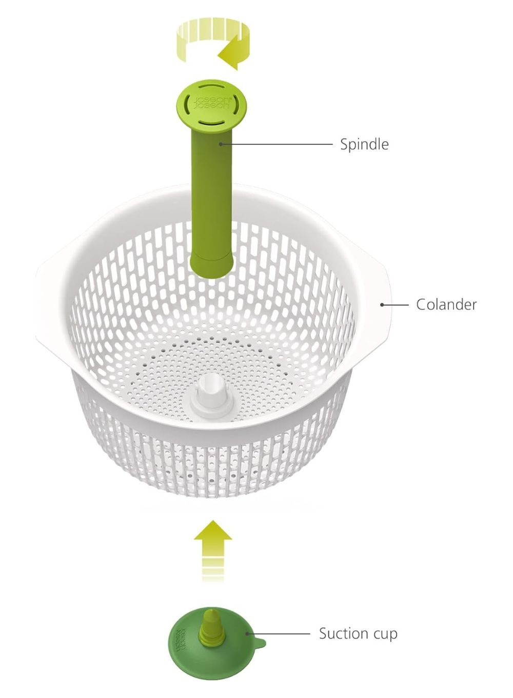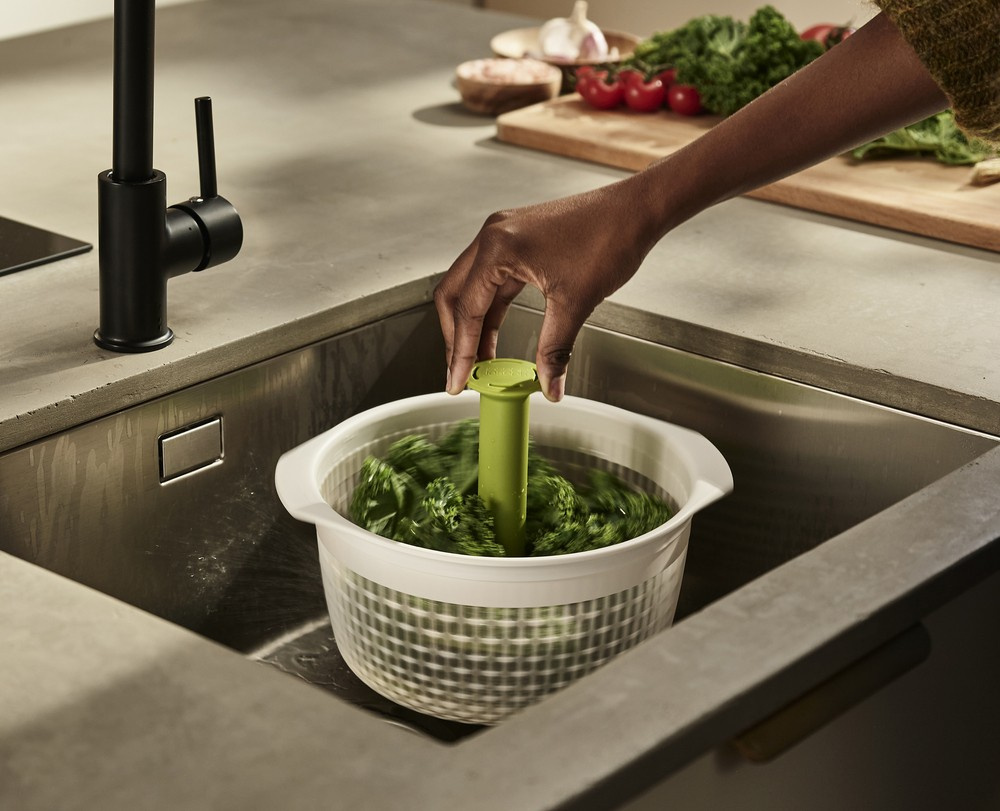Sitko Joseph Joseph Spindola™ łączy wirówkę do liści sałaty i warzyw i durszlak w jednym sprytnym, oszczędzającym miejsce projekcie. Aby przygotować sałatki, zamocuj wrzeciono i przyssawkę do kosza, włóż żywność i opłucz jak zwykle pod bieżącą wodą. Następnie przymocuj durszlak do podstawy zlewu za pomocą przyssawki, a następnie pompuj trzpień w górę i w dół, aby wprawić kosz w obroty i usunąć nadmiar wody.