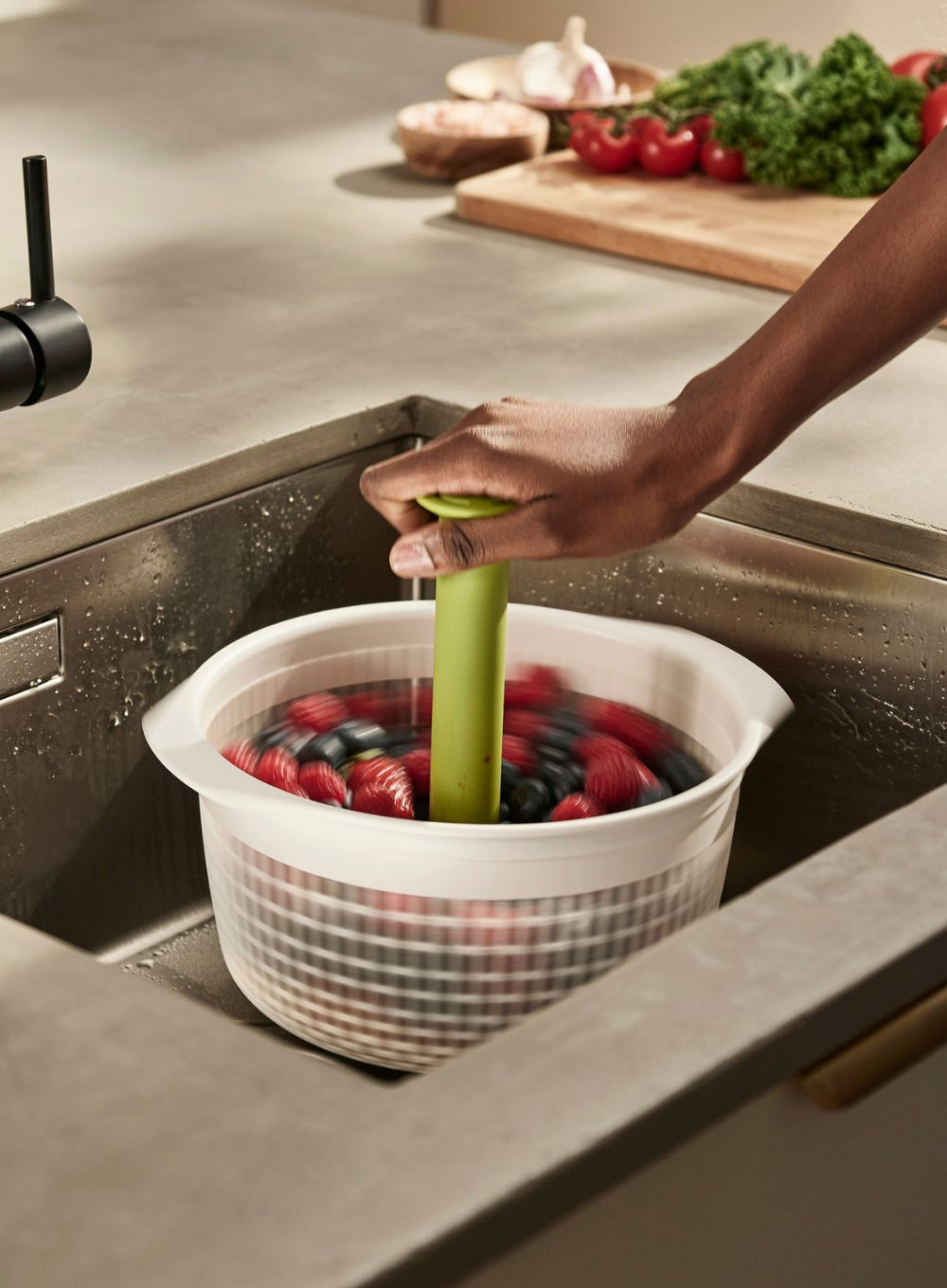 Dwufunkcyjne sitko Joseph Joseph Spindola™ łączy w sobie cechy wirówki do sałaty i durszlaka w jednym, oszczędzając w ten sposób cenne miejsce w szafce.