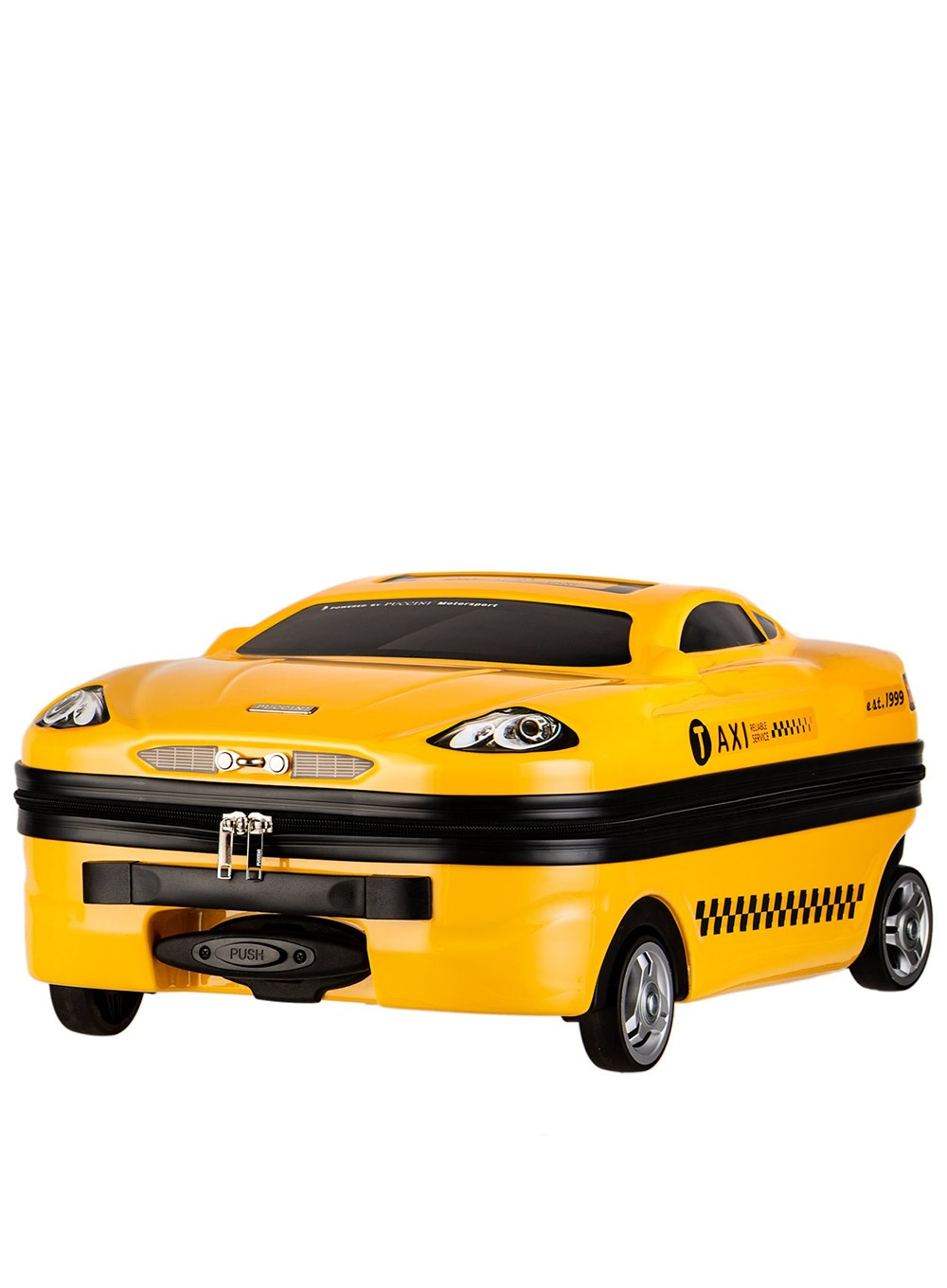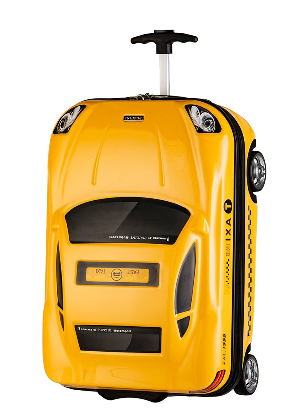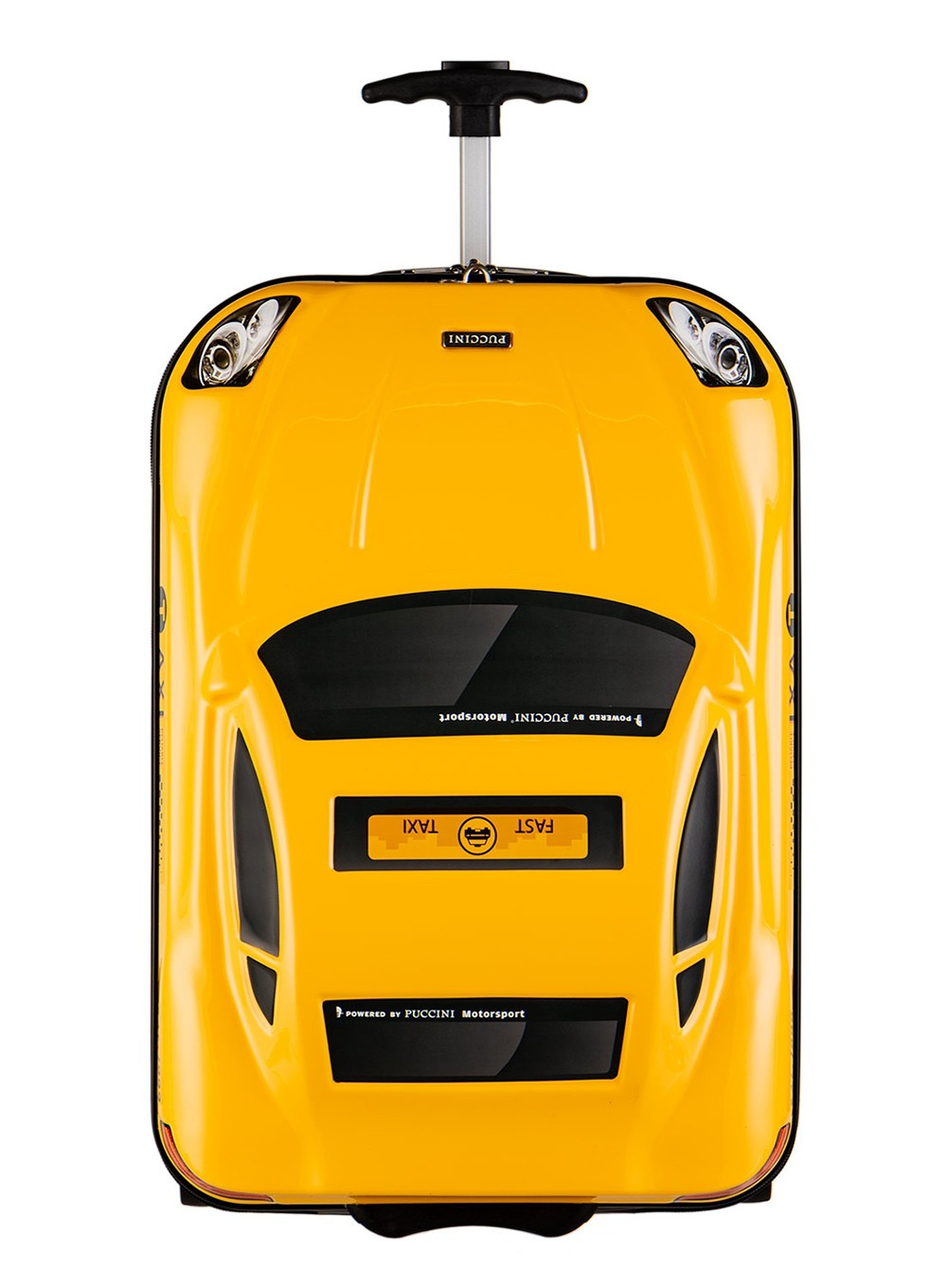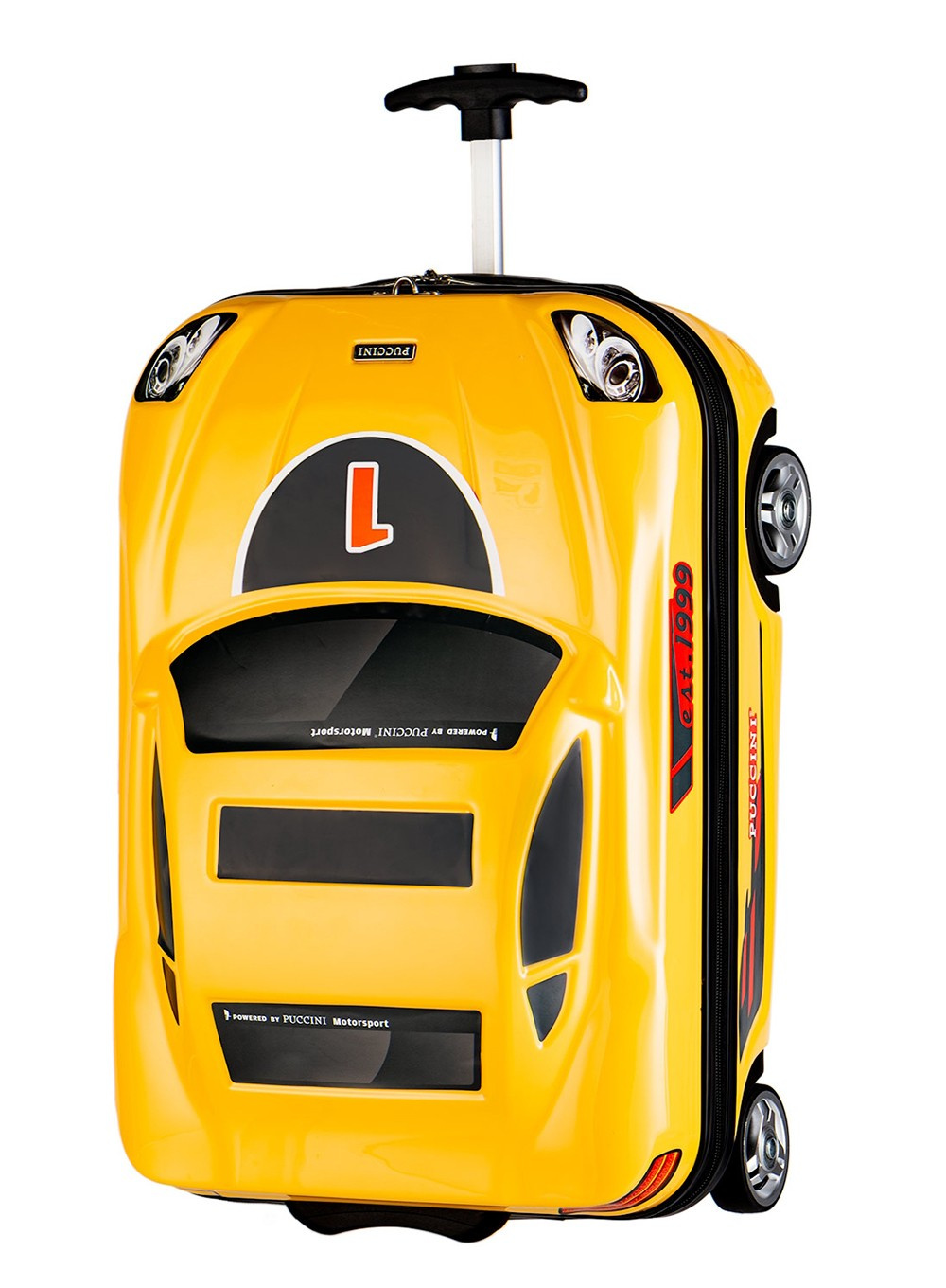 Mała zabawna walizka dziecięca Puccini Dakar w kształcie samochodu. Do każdej walizki dołączone są dwa zestawy naklejek, którymi maluch może ją samodzielnie ozdobić.