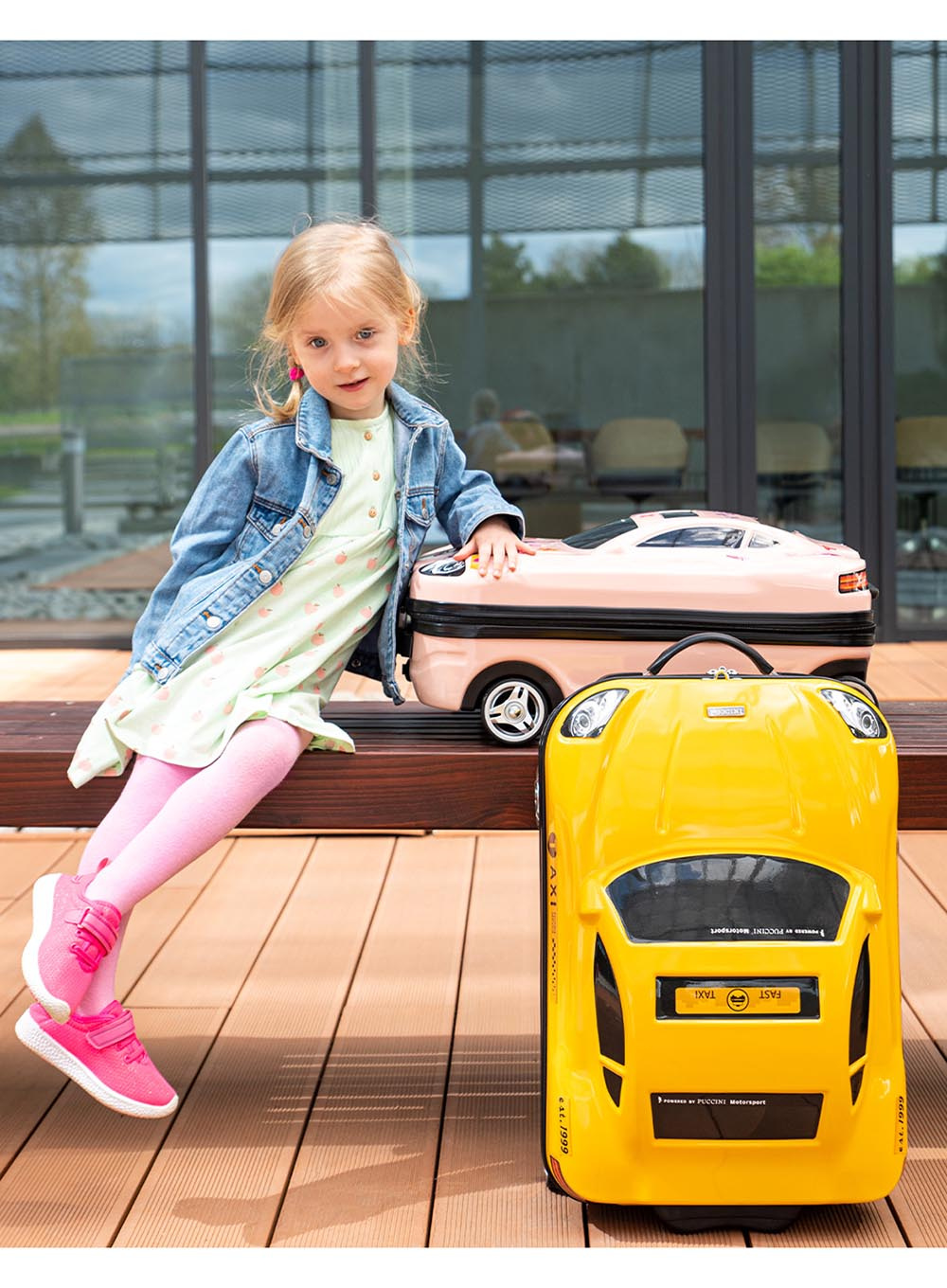 • Dziecko może siedząc na walizce odpychać się nogami (4 koła)