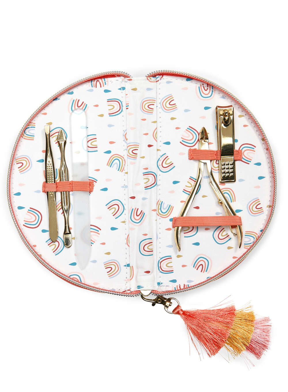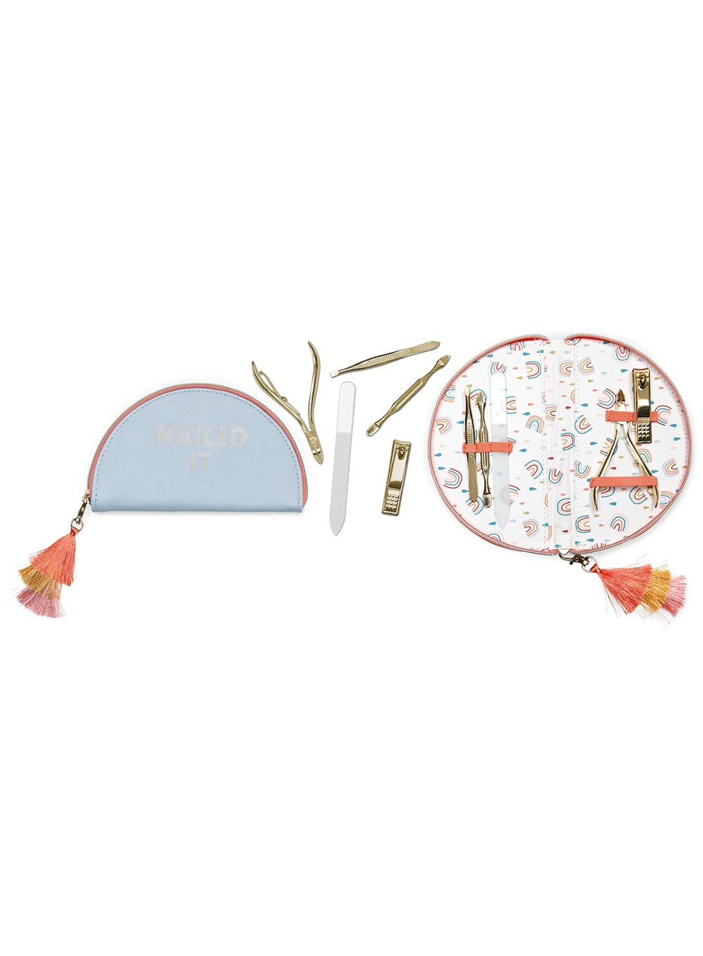 Praktyczny zestaw do manicure Designworks Ink Manicure Kit zawiera obcinacz do paznokci, cążki do skórek, pęsetę, odpychacz / czyścik do skórek i szklany pilnik do paznokci - wszystko zapakowane w ładne małe etui.