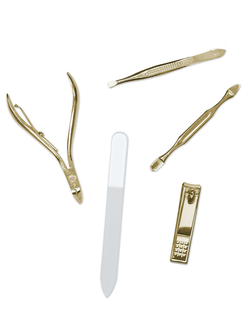 • Zawiera: cążki do paznokci, cążki do skórek, pęsetę, przyrząd do czyszczenia skórek, szklany pilnik