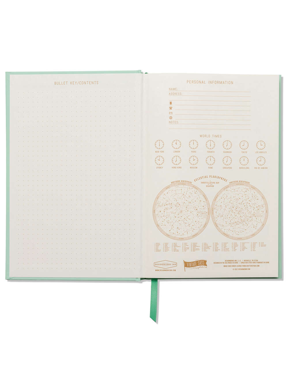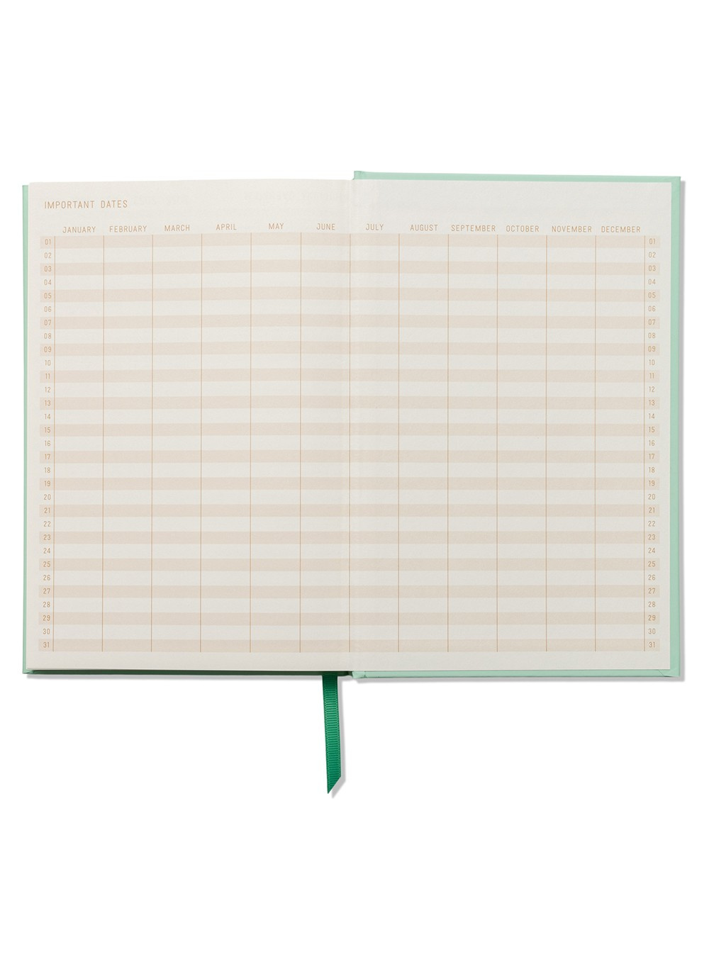 Notatnik ma także zakładkę w postaci satynowej wstążki i przydatne odniesienia: mapę świata, strefy czasowe, tabliczkę mnożenia, zestawienie świąt, ważne daty i miejsce na dane osobowe.