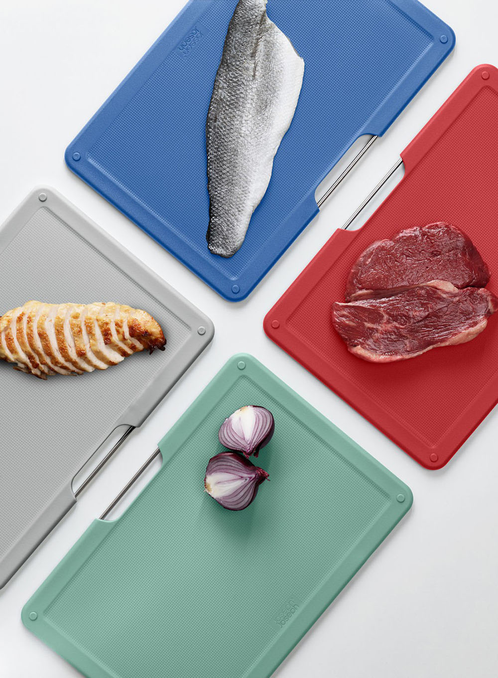 Deski do krojenia Folio Joseph Joseph to zestaw składający się z 4 desek w różnych kolorach umożliwiający dobranie właściwego koloru do wybranej grupy żywności.
