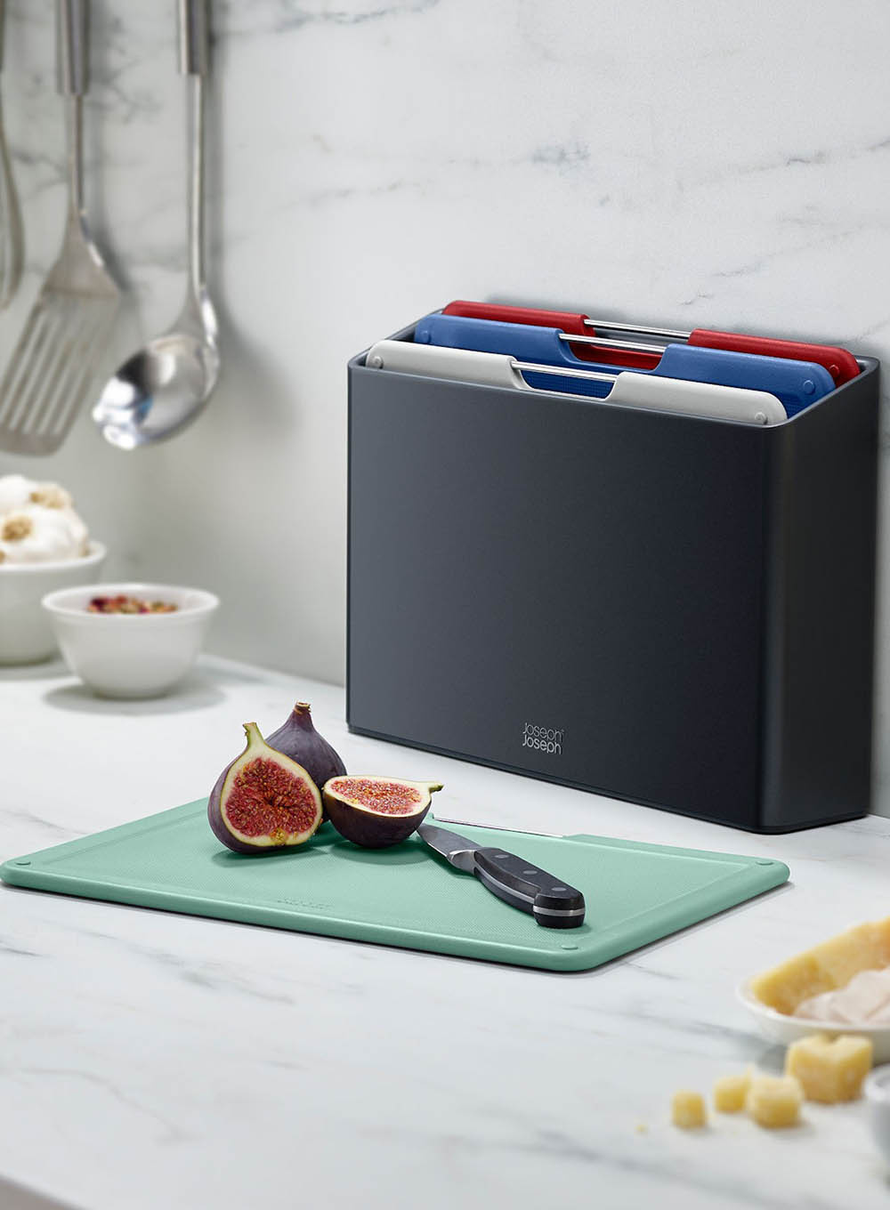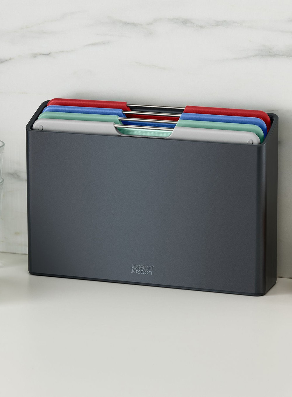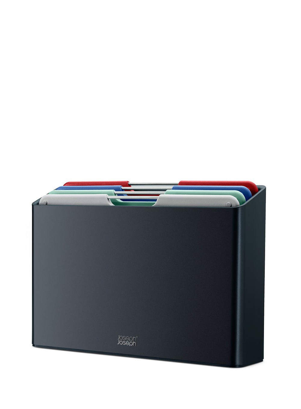 Folio ™ Joseph Joseph zawiera cztery deski do krojenia oznaczone kolorami, które można pięknie uporządkować w eleganckim, smukłym etui. Pięknie zorganizowany zestaw doskonale pasujący na Twój kuchenny blat.