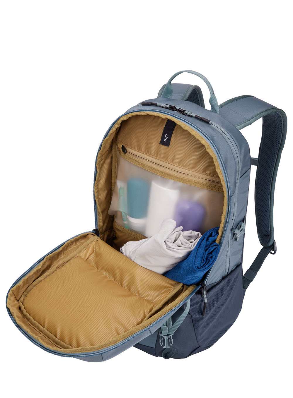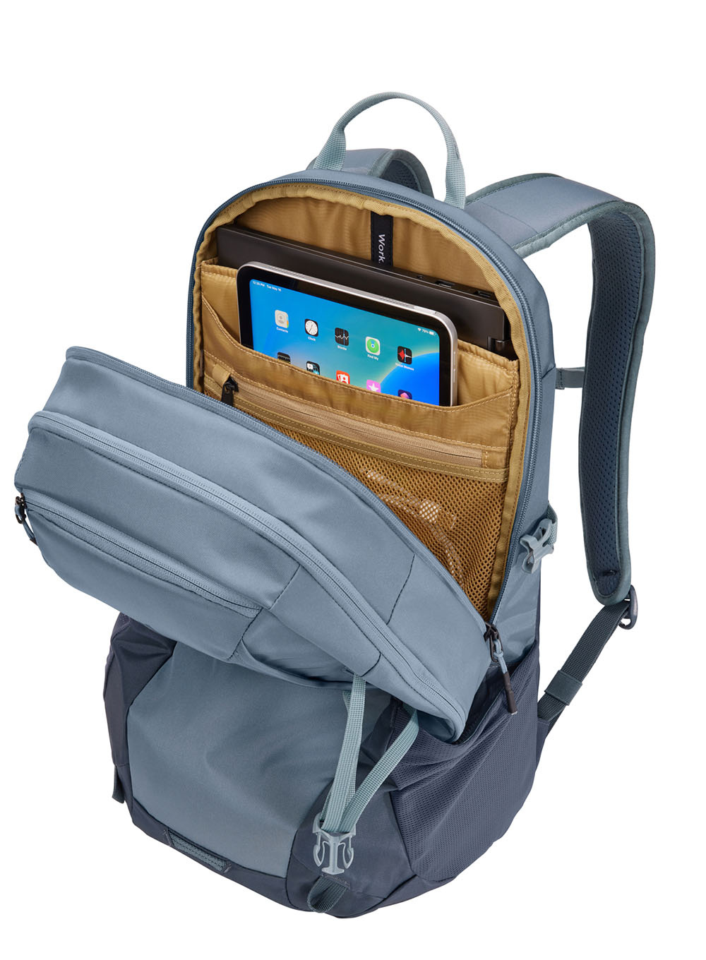 23-litrowy plecak codzienny, outdoorowy Thule EnRoute ma dwie przestronne komory zapinane na zamek, jedną z podwyższonymi oddzielnymi przegrodami na laptopa o przekątnej do 15,6 cala i tablet o przekątnej do 10,5 cala, a także panel organizacyjny do przechowywania akcesoriów. W drugiej komorze jest dużo miejsca np. na dodatkowe ubrania na zmianę oraz dodatkowo zapinana na zamek kieszeń z TPU, która jest wodoodporna i wykonana z matowego materiału.