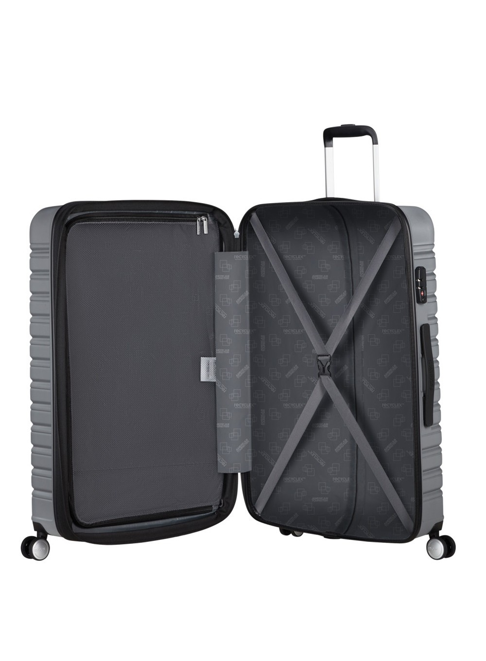 Ta sztywna walizka American Tourister Flashline jest wyposażona w zintegrowany zamek szyfrowy TSA dla większego bezpieczeństwa. Lekki jak na swój rozmiar (4,4 kg), łatwa do manewrowania i poruszania się po różnych nawierzchniach, dzięki regulowanemu uchwytowi z podwójnym stelażem i 4 podwójnym kółkom obrotowym 360°. Posiada również 2 uchwyty (górny i boczny), umożliwiające łatwe podnoszenie, przenoszenia i pokonywanie schodów,.
