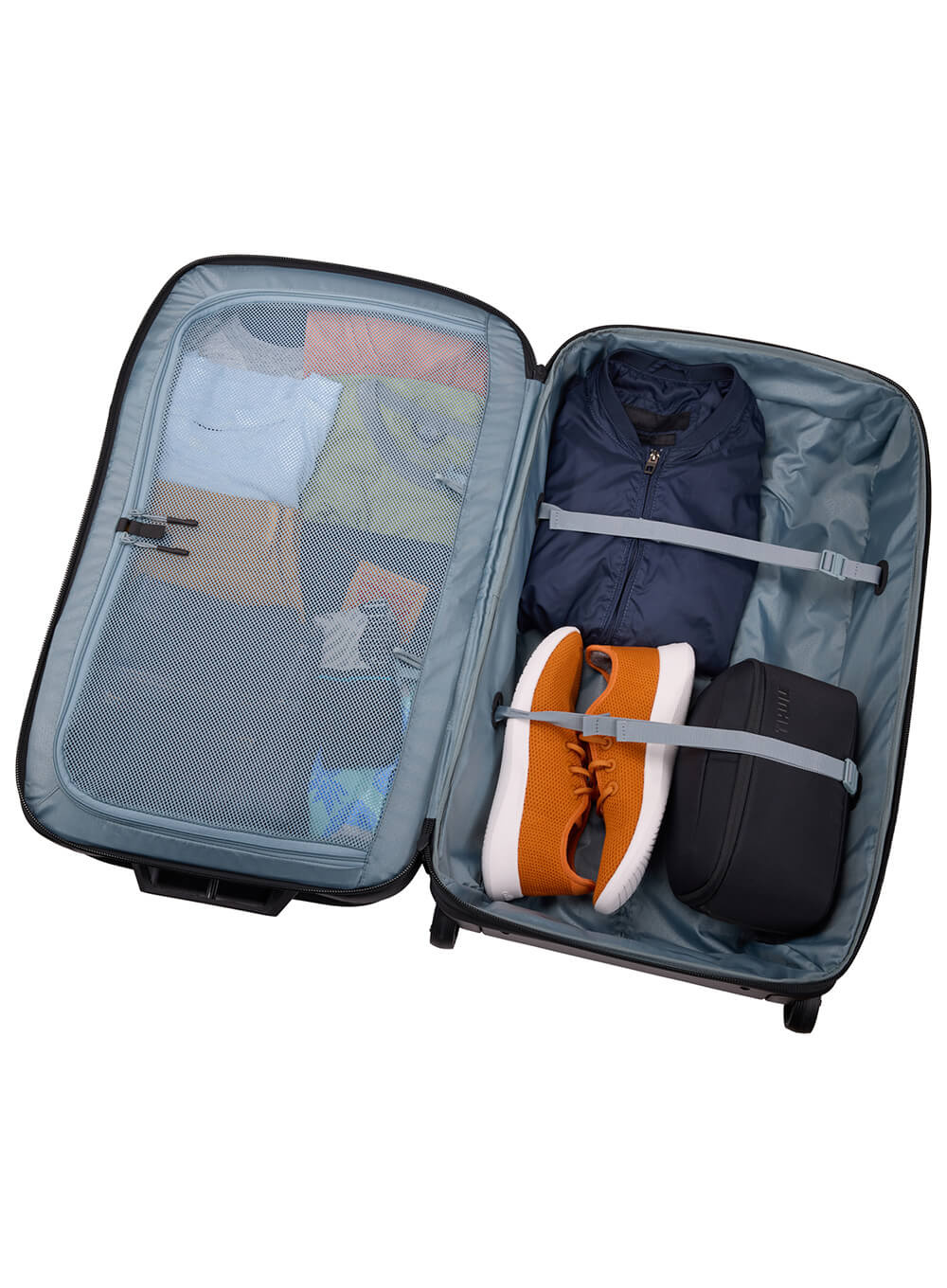 Duża torba podróżna / walizka na dwóch kołach Thule Subterra 2 Wheeled Duffel idealnie nadaje się na około 2-3 tygodnie podróży. Podział wnętrza na dwie oddzielne komory i pasy kompresyjne ułatwiają organizację i zapewniają porządek.