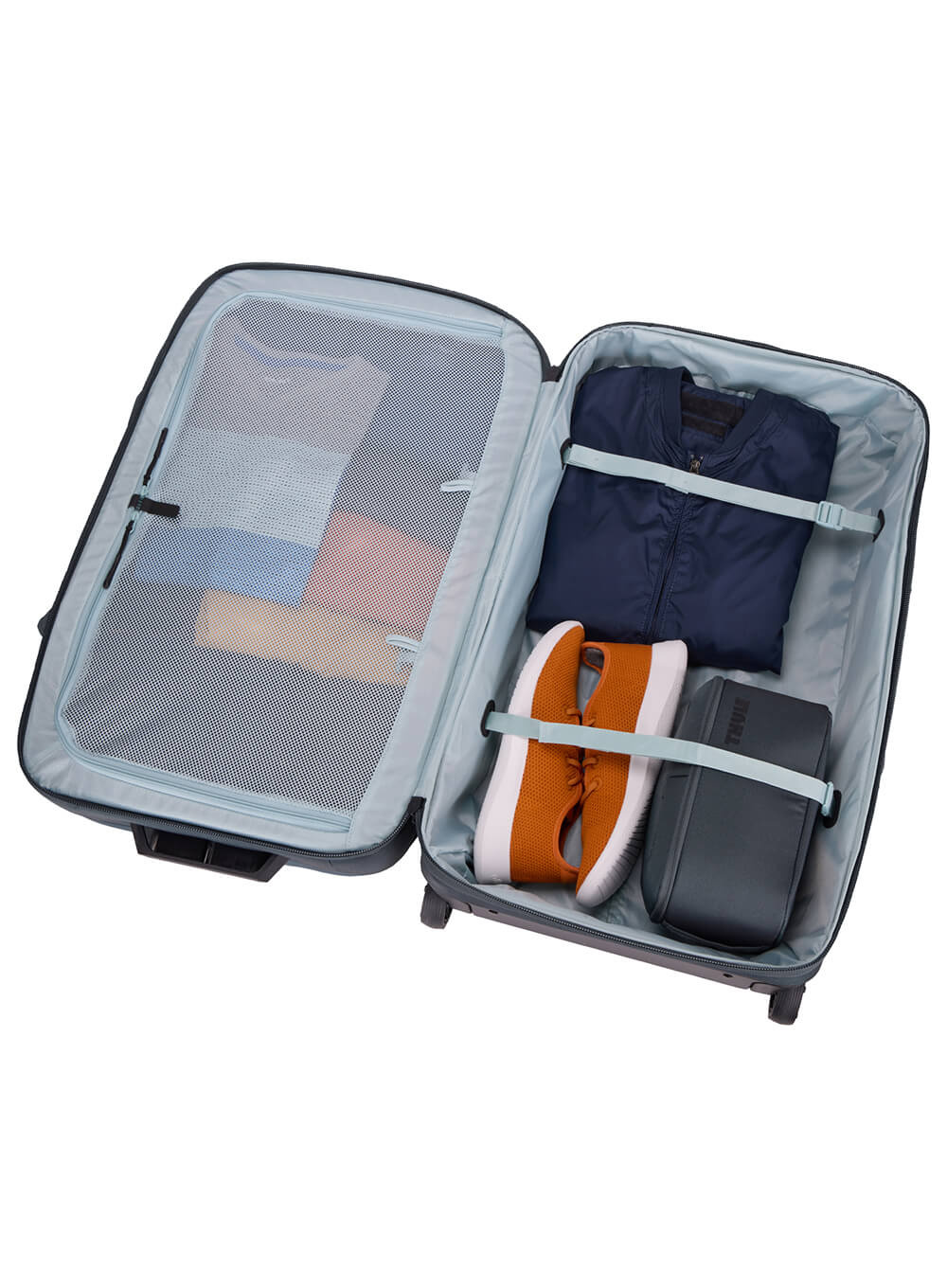 Duża torba podróżna / walizka na dwóch kołach Thule Subterra 2 Wheeled Duffel idealnie nadaje się na około 2-3 tygodnie podróży. Podział wnętrza na dwie oddzielne komory i pasy kompresyjne ułatwiają organizację i zapewniają porządek.