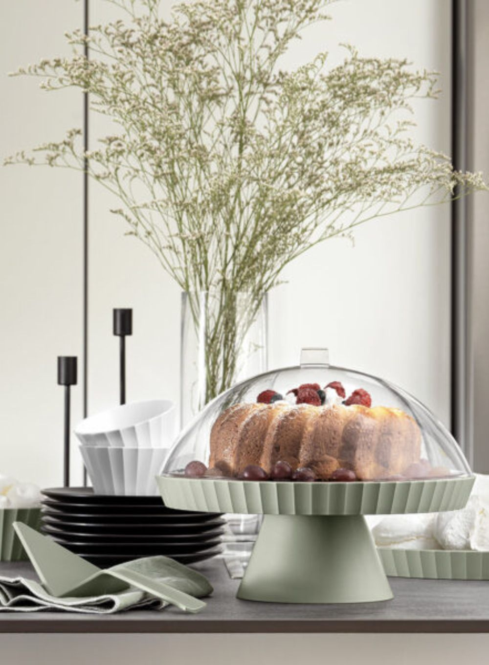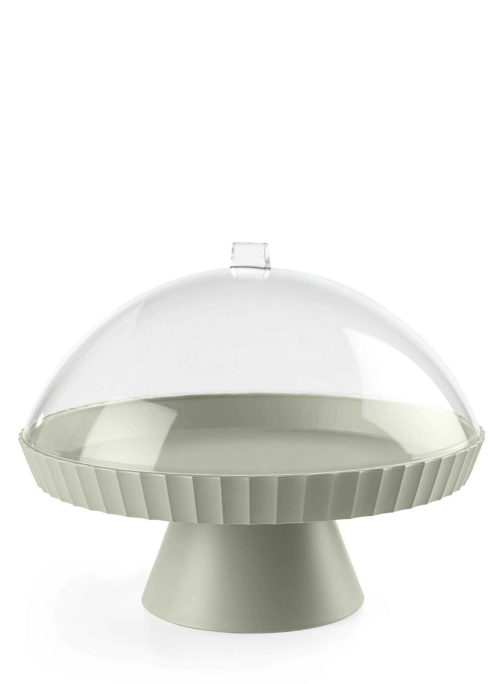 Patera do ciast, deserów z przezroczystą pokrywą i łopatką do serwowania Blim+ Agora Ø 30 cm zabezpiecza jedzenie przed brudem, kurzem, wilgocią, pozwala zachować świeżość i pięknie je prezentuje.