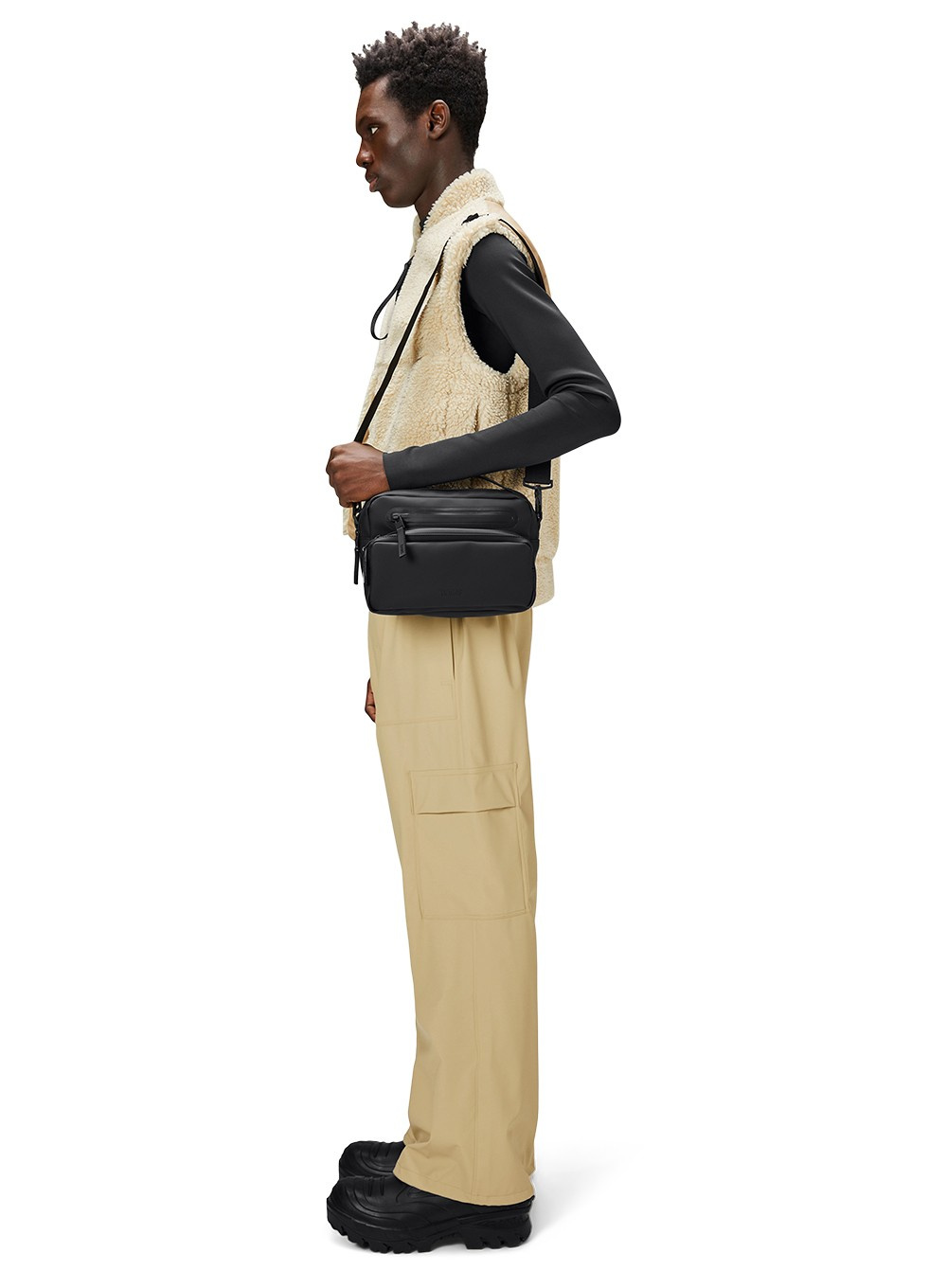 Jej minimalistyczna, pudełkowa sylwetka pasuje do różnego rodzaju stylizacji, a rozmiar jest idealny do noszenia dodatkowej lekkiej kurtki, małych urządzeń, portfela i nie tylko. Model posiada wewnętrzne i zewnętrzne kieszenie oraz jest wykończony regulowanym, odpinanym paskiem mocowanym za pomocą karabińczyków.