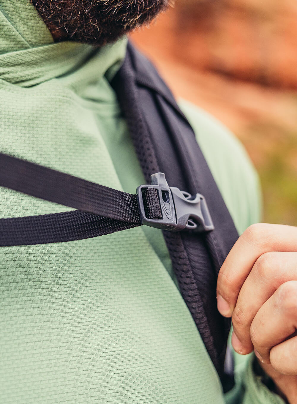 • Perforowane, oddychające szelki ramienne z paskiem mostkowym i zintegrowanym gwizdkiem ostrzegawczym
