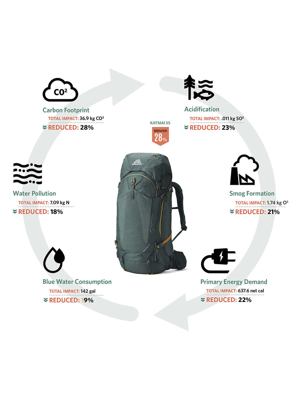 - Dzięki zastosowaniu tkanin pochodzących z recyklingu ślad węglowy plecaka jest zmniejszony o 28% w porównaniu z konwencjonalnym plecakiem nylonowym