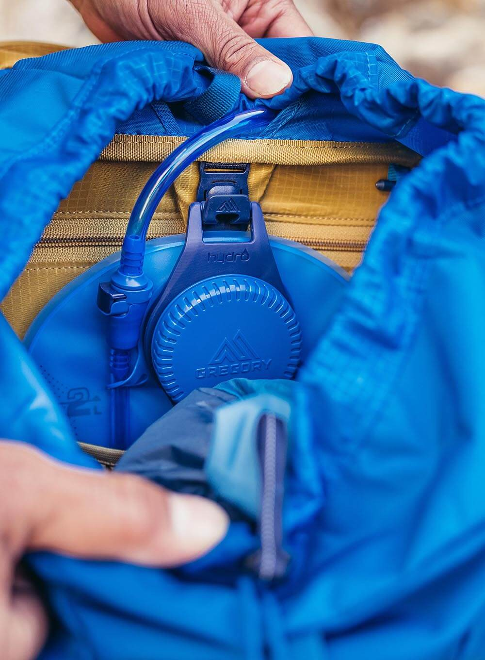 - Wewnętrzny rękaw na hydratację z mocowaniem SpeedClip kompatybilny z bukłakiem Gregory's 3D Hydro Trek Reservoir (zbiornik nie wchodzi w skład zestawu)