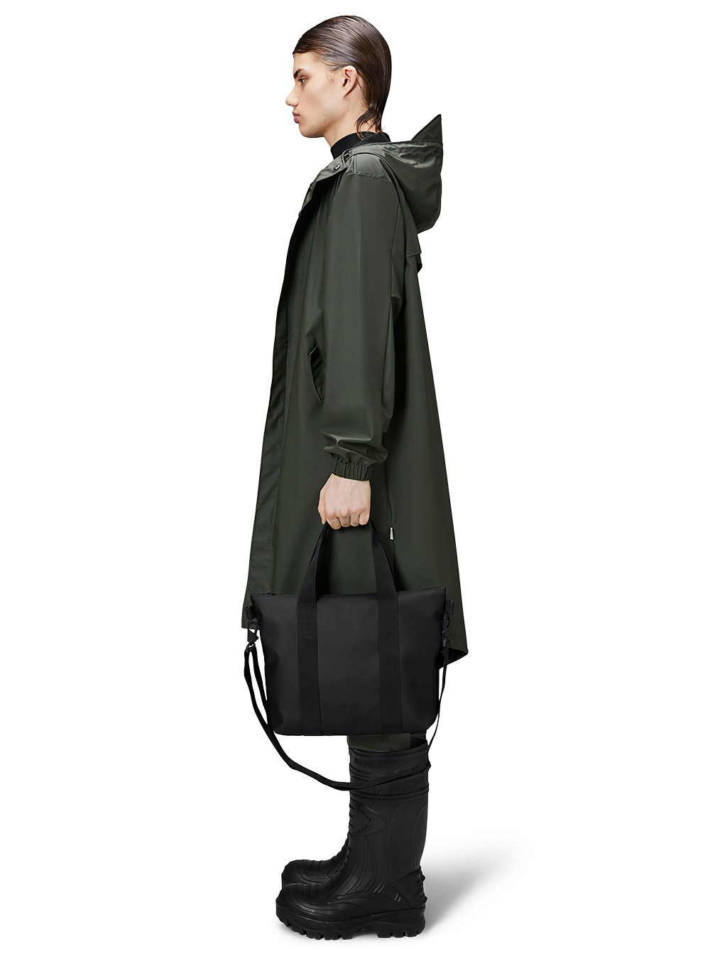 Rains Tote Bag Micro to kompaktowa wodoodporna torba idealna na codzienne niezbędne rzeczy. Projekt jest wykończony dyskretnymi funkcjonalnymi detalami, które nadają mu użytkowy i nowoczesny wygląd.