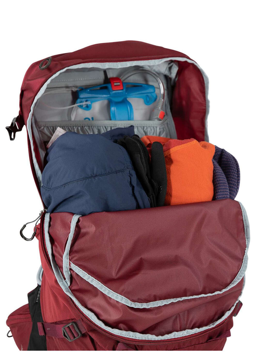 • Wewnętrzna kieszeń hydracyjna z otworem na wąż w panelu tylnym i zaczepem Osprey HydraClip do łatwego zawieszenia bukłaka