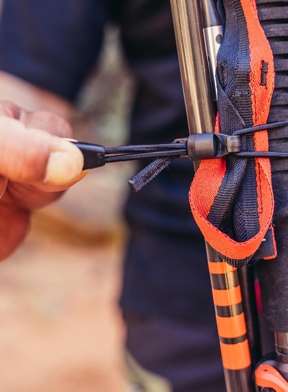 • System mocowania kijów trekkingowych z regulowanymi pętlami typu bungee oraz pętlami na dole