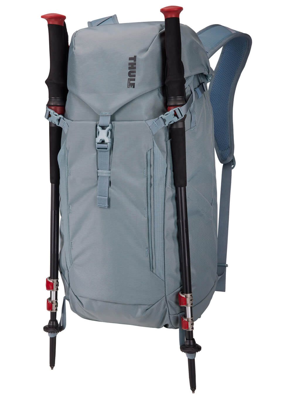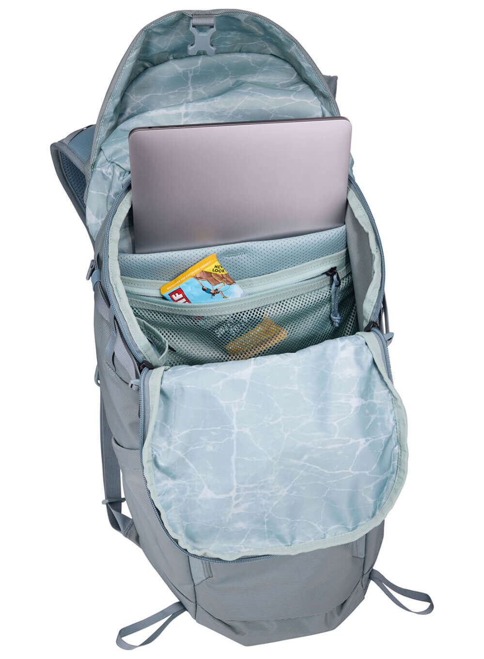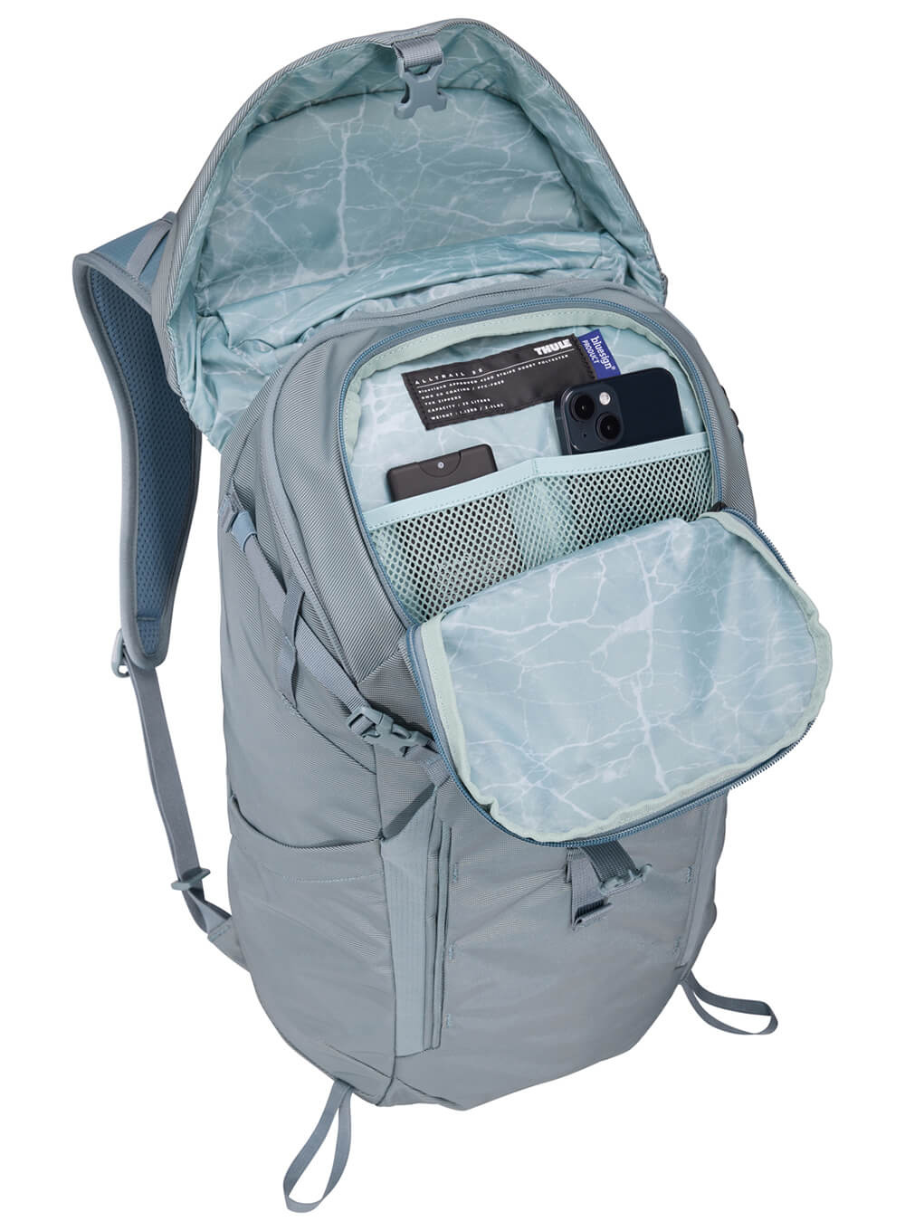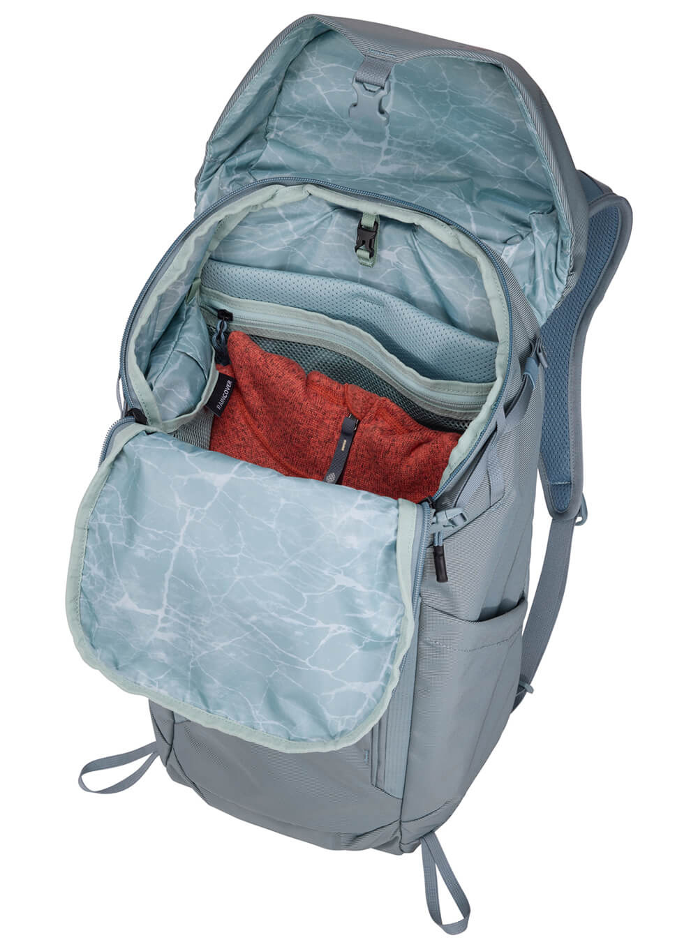 Thule AllTrail 25 l to praktyczny plecak turystyczny idealny na krótkie i dłuższe wycieczki poza miasto. Dostęp do komory głównej przez zamek błyskawiczny znajduje się na górze plecaka, ukryty jest pod klapą. Górna kieszeń w klapie plecaka stanowi doskonałą przestrzeń na mniejsze akcesoria, które wymagają szybkiego dostępu i ma klips na klucze.