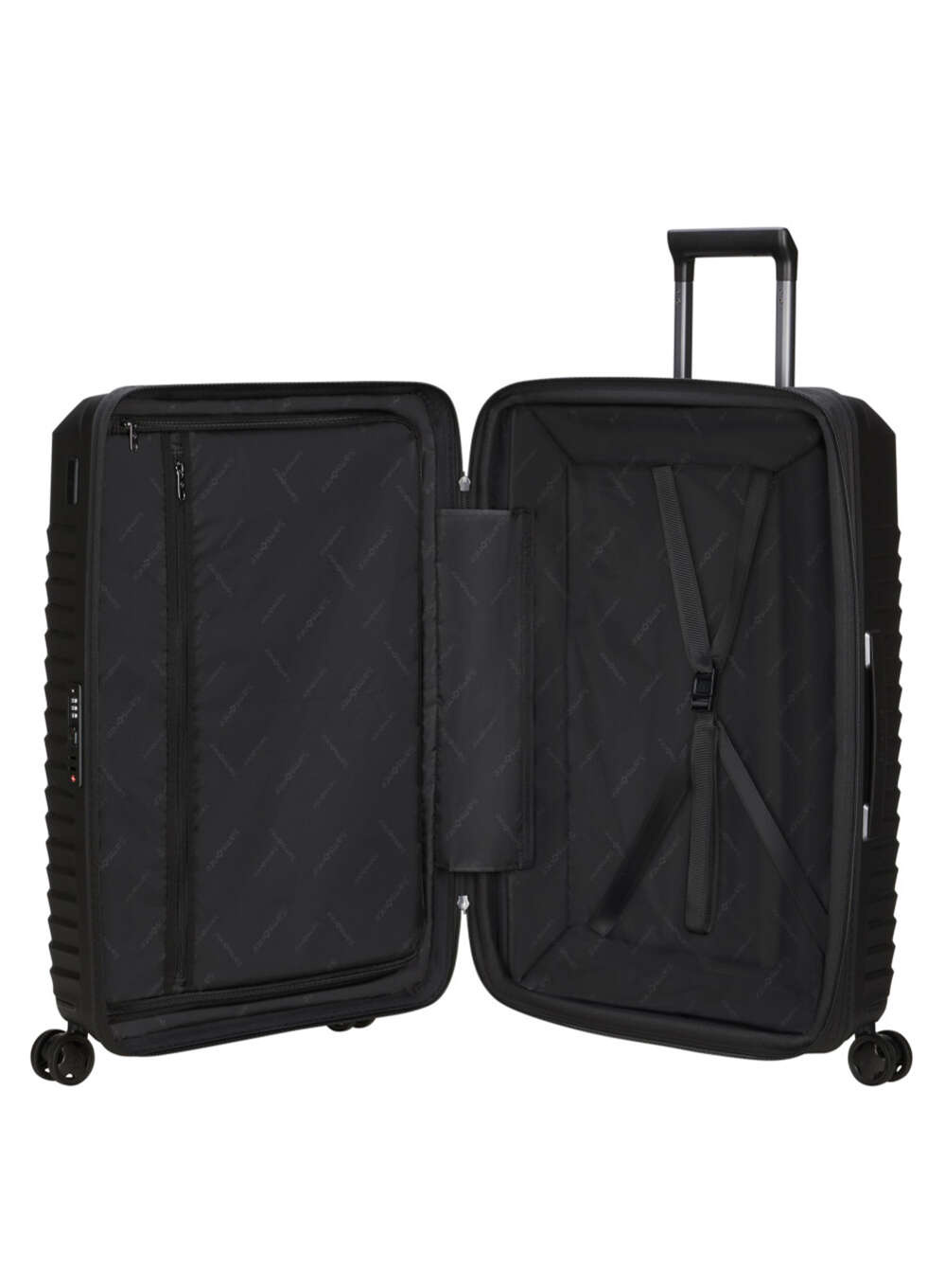 Przemyślane, praktycznie zaprojektowane wnętrze z podszewką z recyklingu zapewnia łatwą organizację. Standardowy podział na dwie komory ułatwia pakowanie i szybkie odnalezienie potrzebnych rzeczy; w górnej komorze walizki znajduje się przegroda z materiału z zasuwaną kieszenią, a dolna komora ma pasy mocujące utrzymujące wszystko na miejscu.