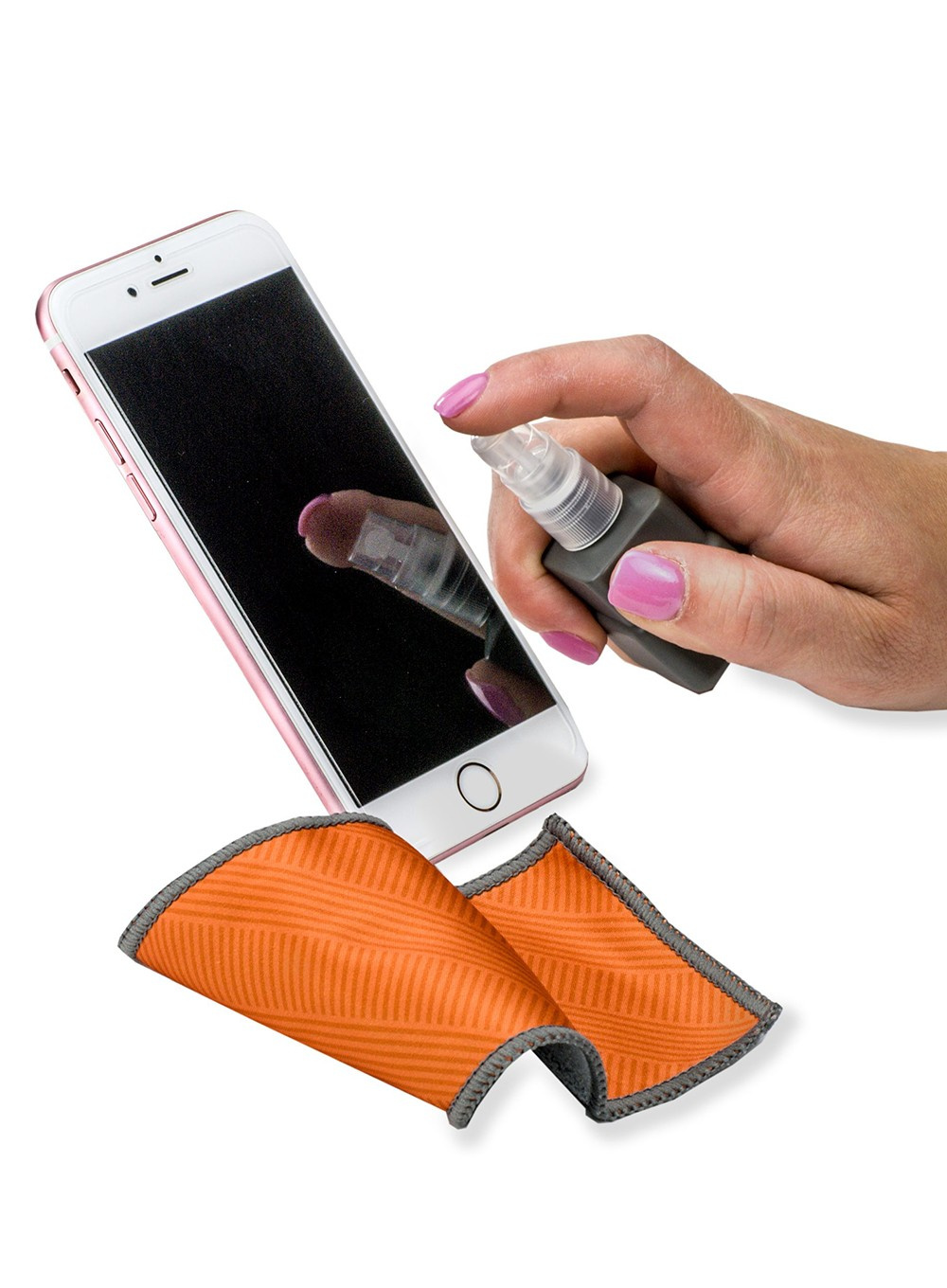 • W zestawie: spray bezalkoholowy i niezawierający amoniaku roztwór czyszczący do soczewek i ekranów, dwustronna ściereczka z mikrofibry