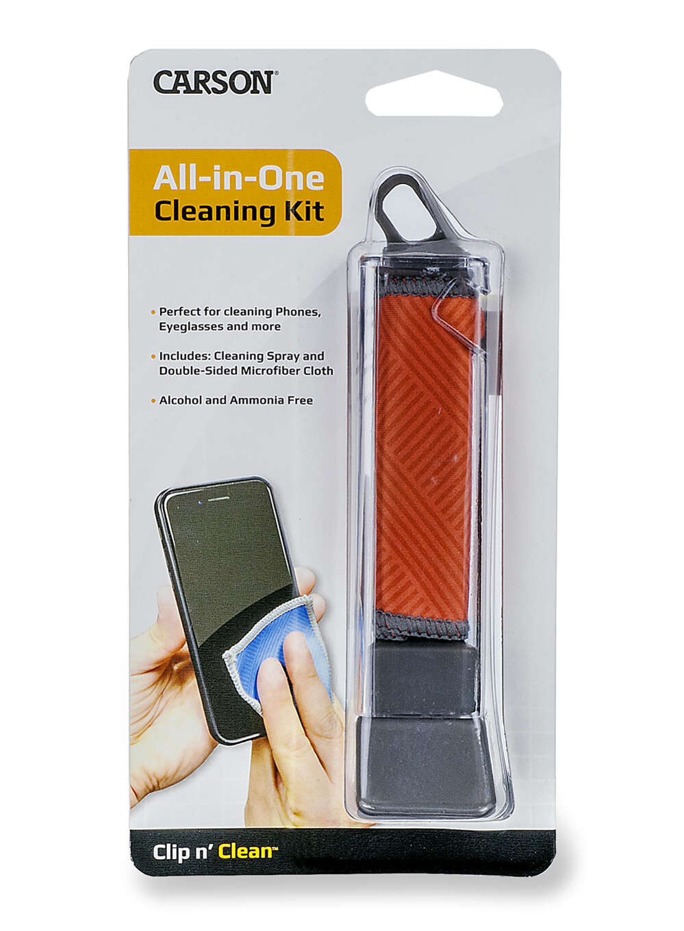 Carson Clip n’ Clean™ to kompleksowy zestaw do czyszczenia ekranu i obiektywu, przeznaczony dla osób w podróży. Idealny do czyszczenia smartfonów, okularów czy okularów przeciwsłonecznych. Każdy element mieści się w wygodnym etui z plastikową pętlą, którą można przypiąć do karabińczyków, smyczy i breloczków do kluczy.