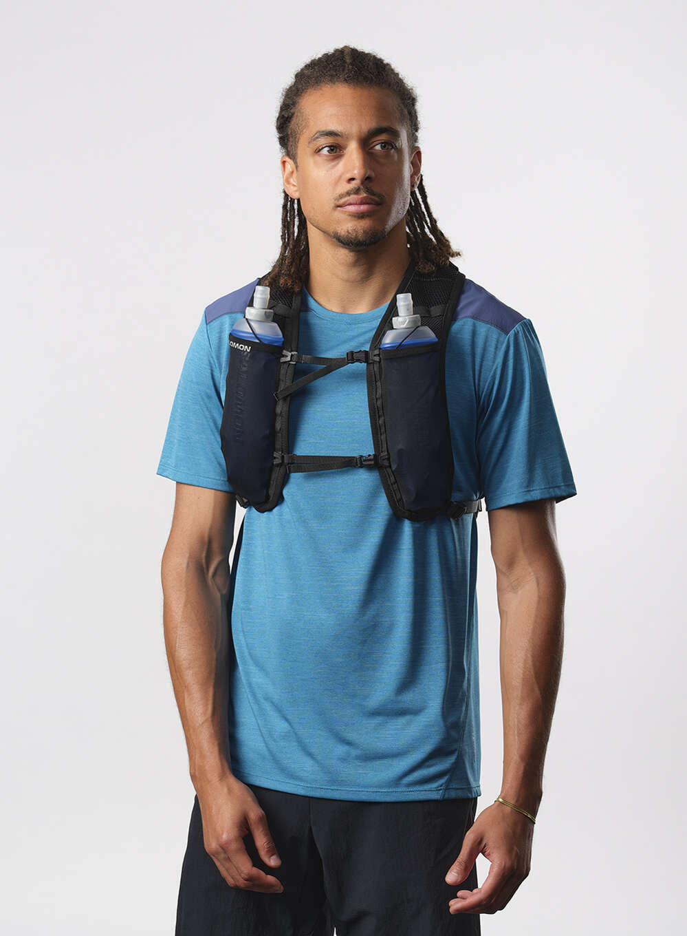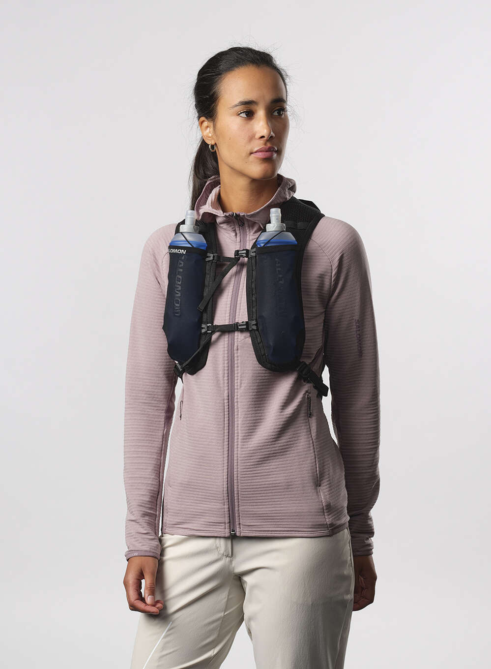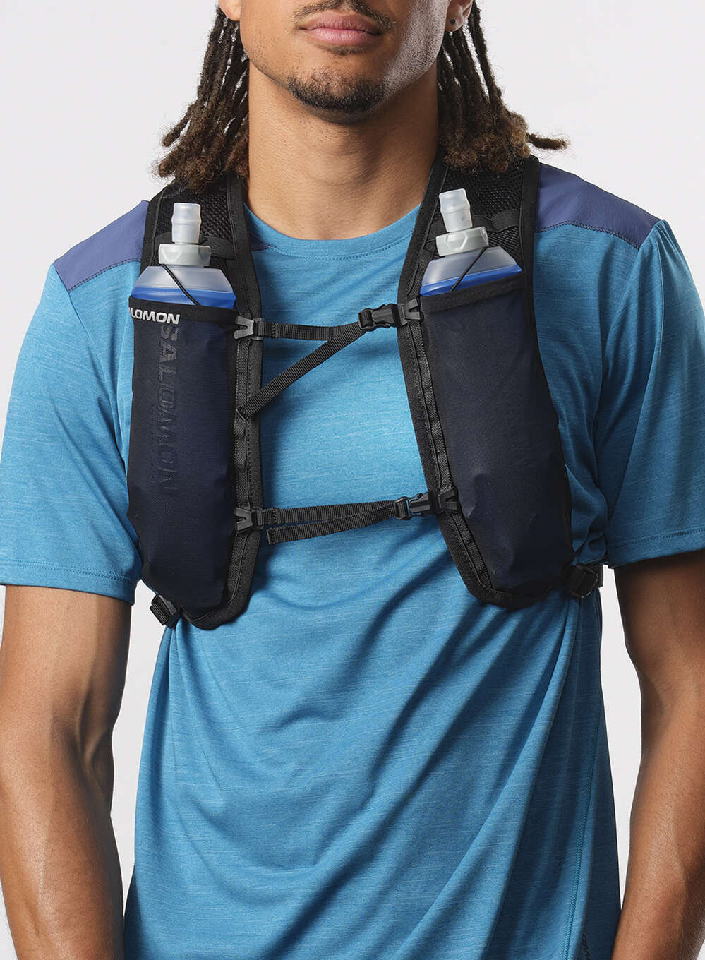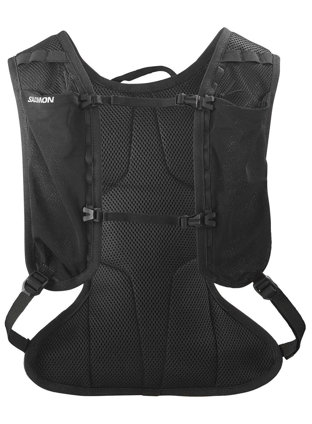 - Dwie przednie kieszenie na piersi: zaprojektowane tak, aby pasowały do miękkich bidonów Salomon, przednie kieszenie ograniczają podskakiwanie.